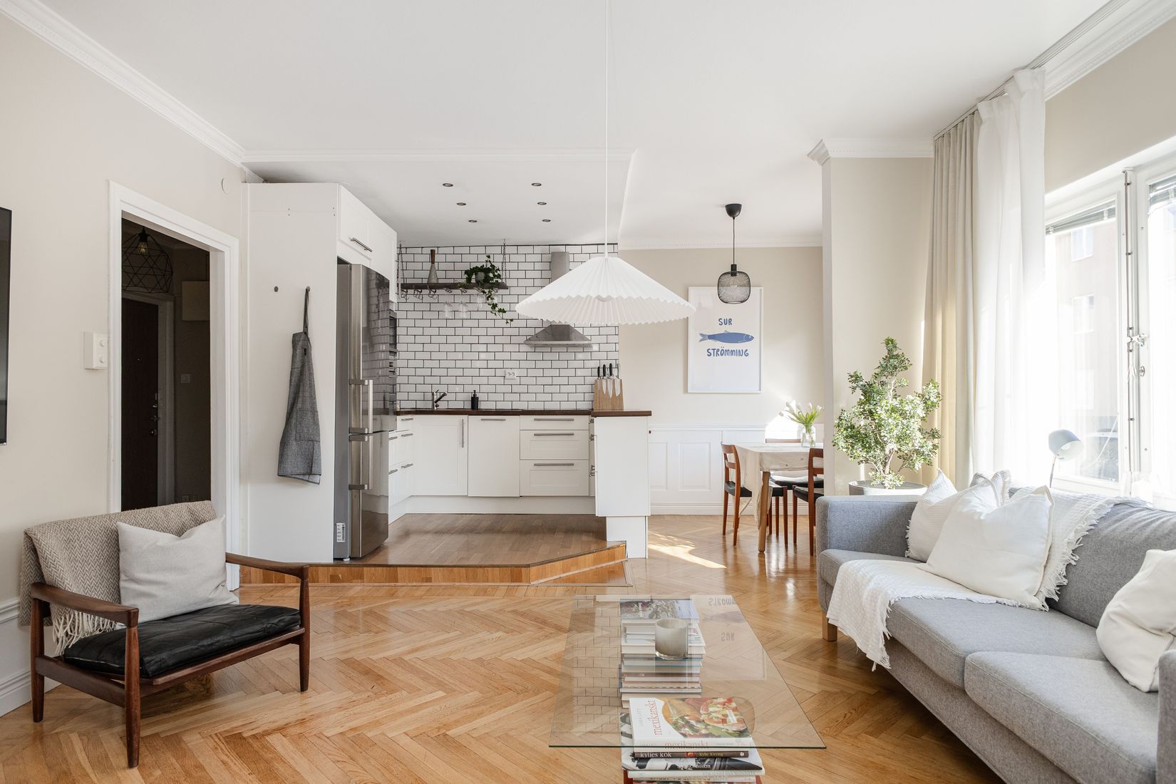 Vardagsrummet är generöst tilltaget med stora fönster som ger ett fantastiskt ljusinsläpp och skapar en luftig känsla, medan den vackra fiskbensparketten förstärker bostadens charm. Här finns gott om plats för både soffgrupp och matplats - perfekt för såväl vardag som sociala tillställningar.