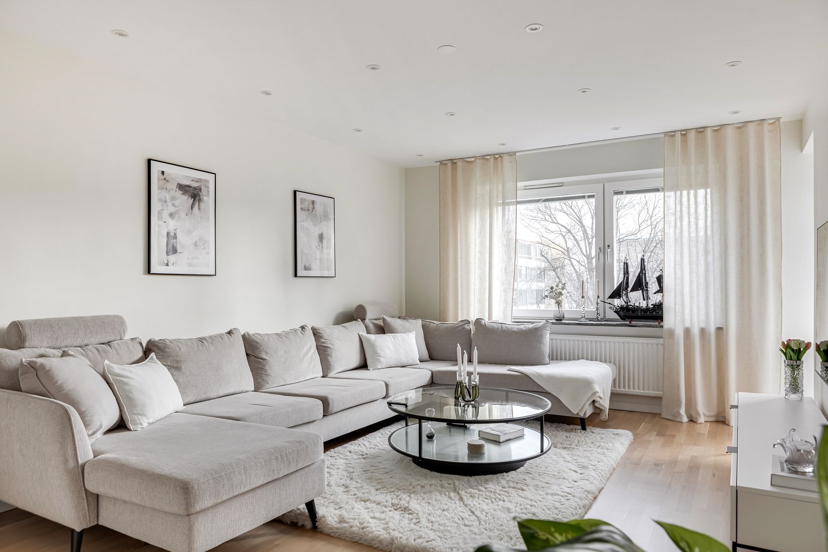 Från det ljusa vardagsrummet når du den inglasade balkongen som fungerar som ett extra rum stora delar av året – en perfekt plats för avkoppling och sociala stunder.
