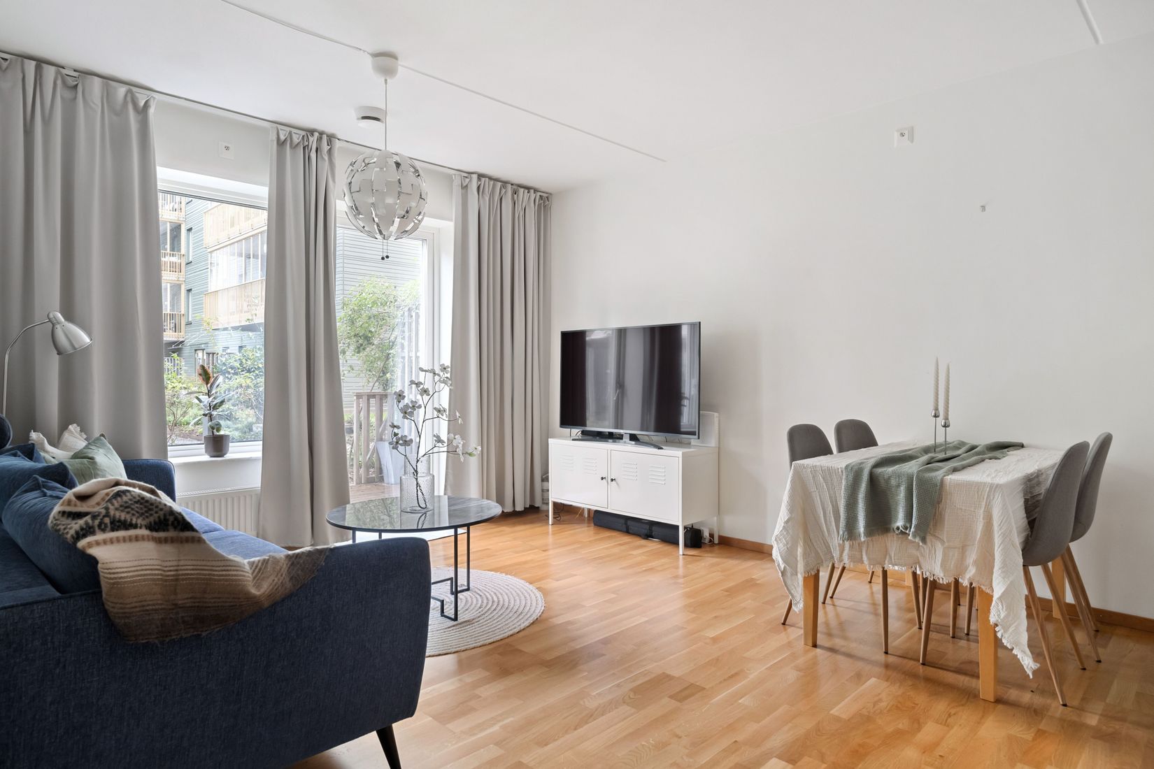 Det rymliga vardagsrummet smälter samman med det stilrena köket i en öppen och ljus planlösning. Med stora fönsterpartier flödar ljuset in, och här finns gott om plats för både soffgrupp och matbord. Köket har generösa arbetsytor och förvaring, samt köksmaskiner i vit design som smälter in i den moderna inredningen.