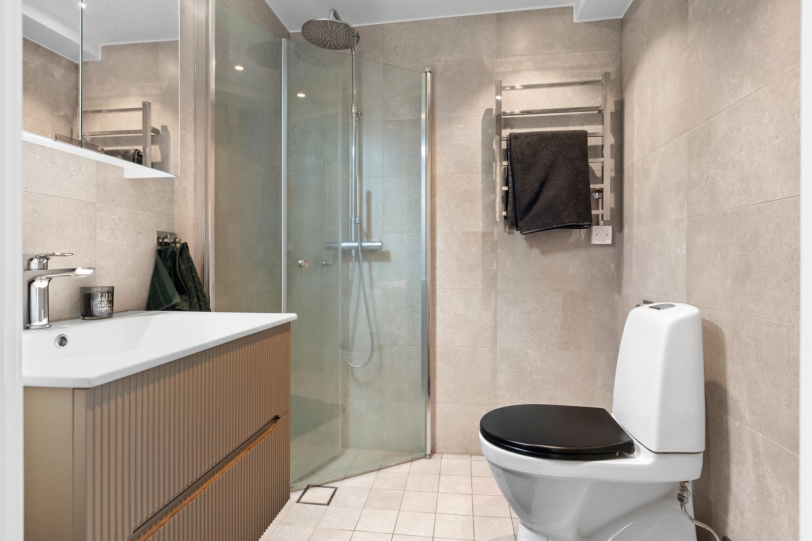 Det stilrena badrummet har en lyxig hotellkänsla med stora rektangulära kakelplattor i en varm beige ton och matchande klinkergolv med komfortvärme. Här finns dusch med glasade duschväggar, handdukstork, toalett, handfat med kommod och spegelskåp.