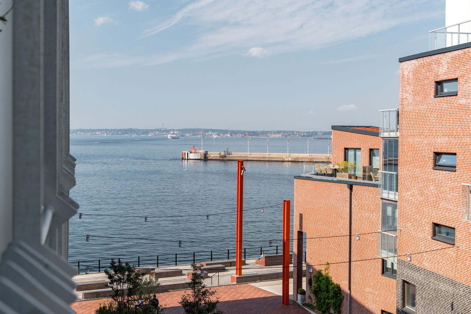 Redan när du kliver in i lägenheten möts du av det som gör den så unik – ljuset och utsikten. Från varje fönster breder Öresund ut sig i all sin prakt. Det spelar ingen roll var du befinner dig i bostaden – du ser havet. I klart väder blickar du hela vägen ner mot Norra hamnen, och varje dag bjuder på nya vyer när färjorna till och från Helsingör passerar utanför. Vyn från den inglasade balkongen är något utöver det vanliga: här ser du rakt mot hamninloppet, där båtar, seglare och fartyg rör sig i ett ständigt skådespel. Det är ett levande panorama, morgon som kväll.