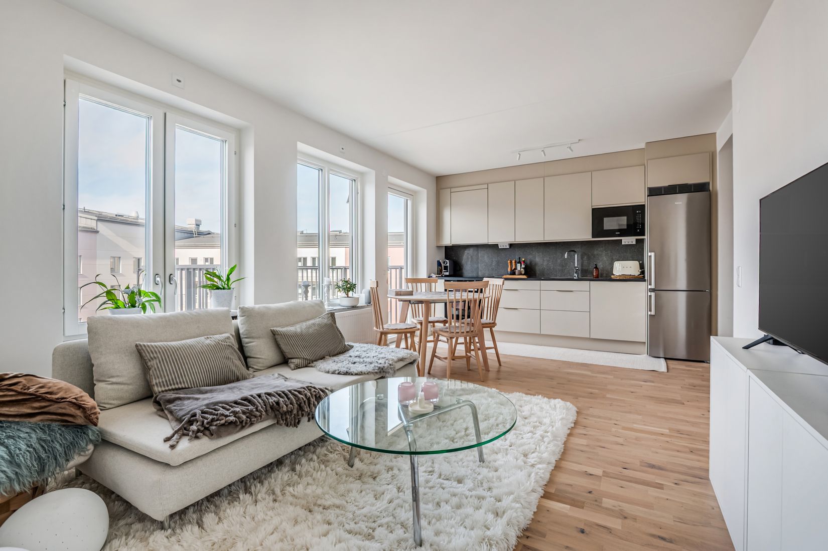 Köket är modernt och funktionellt, fullt utrustat med kombinerad kyl/frys, diskmaskin, mikrovågsugn, ugn och induktionshäll. Den stilrena inredningen i beige toner som skiftar mot ljusgrått skapar en varm och harmonisk atmosfär.
