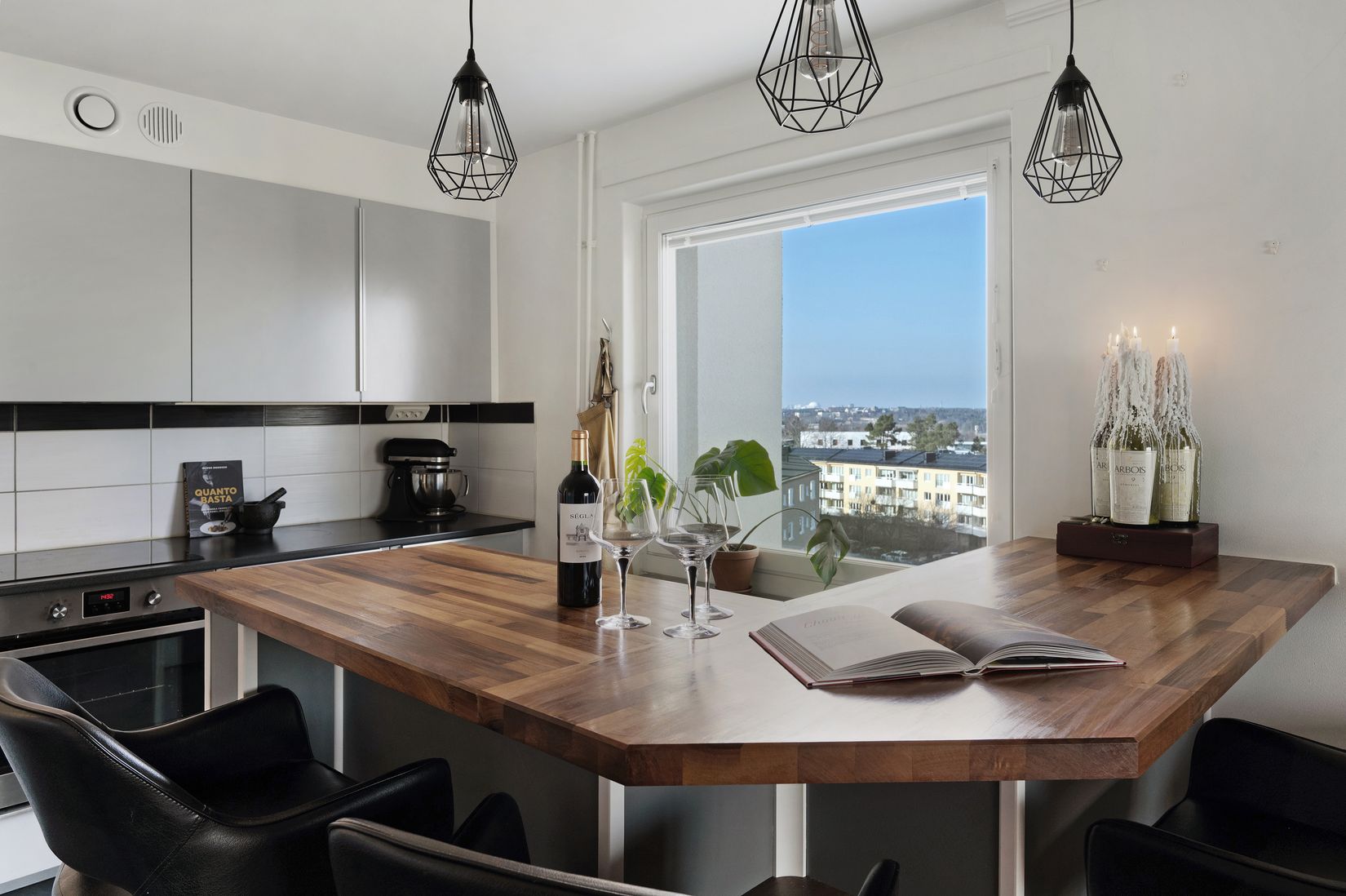 Lägenheten har ett socialt och öppet kök i grått med mörk bänkskiva, köksö/bardel med förvaring, vinkyl och sittplatser samt en liten glimt av sjön Drevviken samt Globen.