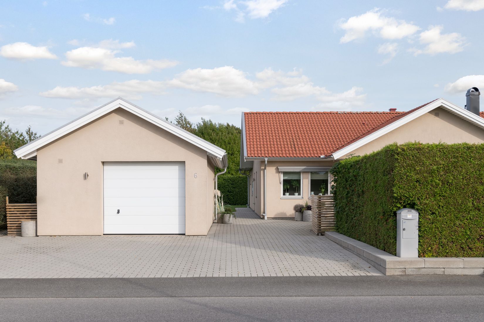 Från de sociala delarna av bostaden nås trädgården där två separata uteplatser skapar goda möjligheter att följa solen under dagens olika timmar. Den insynsskyddade tomten ramas in av grönska och ger en privat och rofylld utemiljö. Här finns gott om plats för både avkoppling och sociala tillställningar, oavsett om det handlar om sommarens middagar, lugna morgnar eller umgänge med familj och vänner.