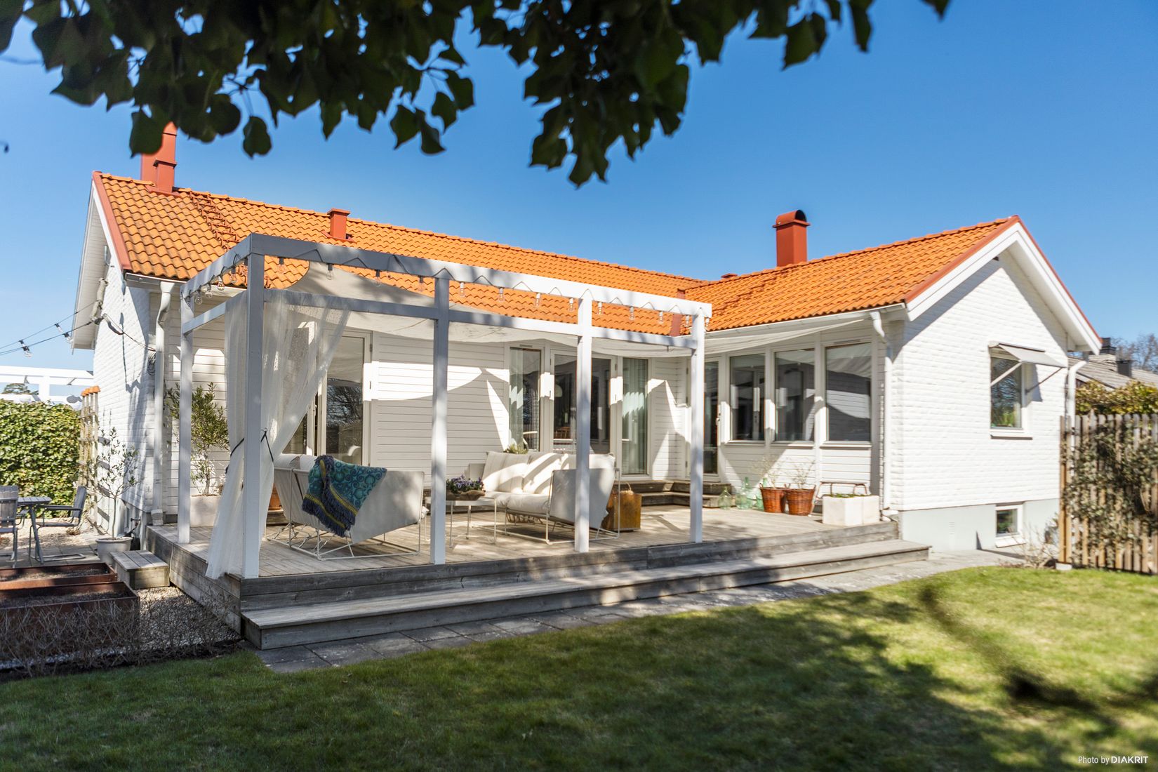 Trädgården är något alldeles extra, en grönskande oas med vackra perenner, flera uteplatser och rumsliga miljöer. Här finns även en inspirerande köksträdgård för den odlingsintresserade. Trädgårdens baksida som också är insynsskyddad och i etage ger en känsla av en privat oas, vilket är den självklara platsen att koppla av på i lugn och ro.