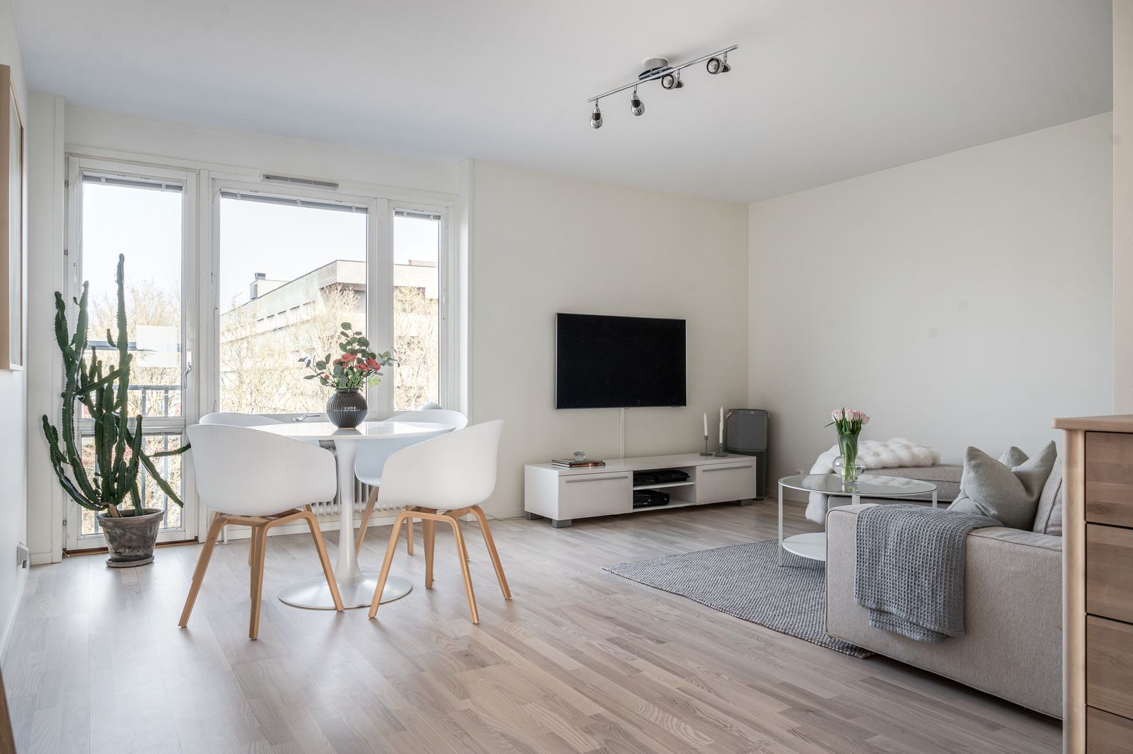 Vardagsrummet är rymligt och ljust med stora fönsterpartier som släpper in rikligt med dagsljus. Här finns gott om plats för både soffgrupp och matplats, en perfekt yta för sociala tillställningar eller lugna kvällar hemma med din favoritserie och väl valda tillbehör!