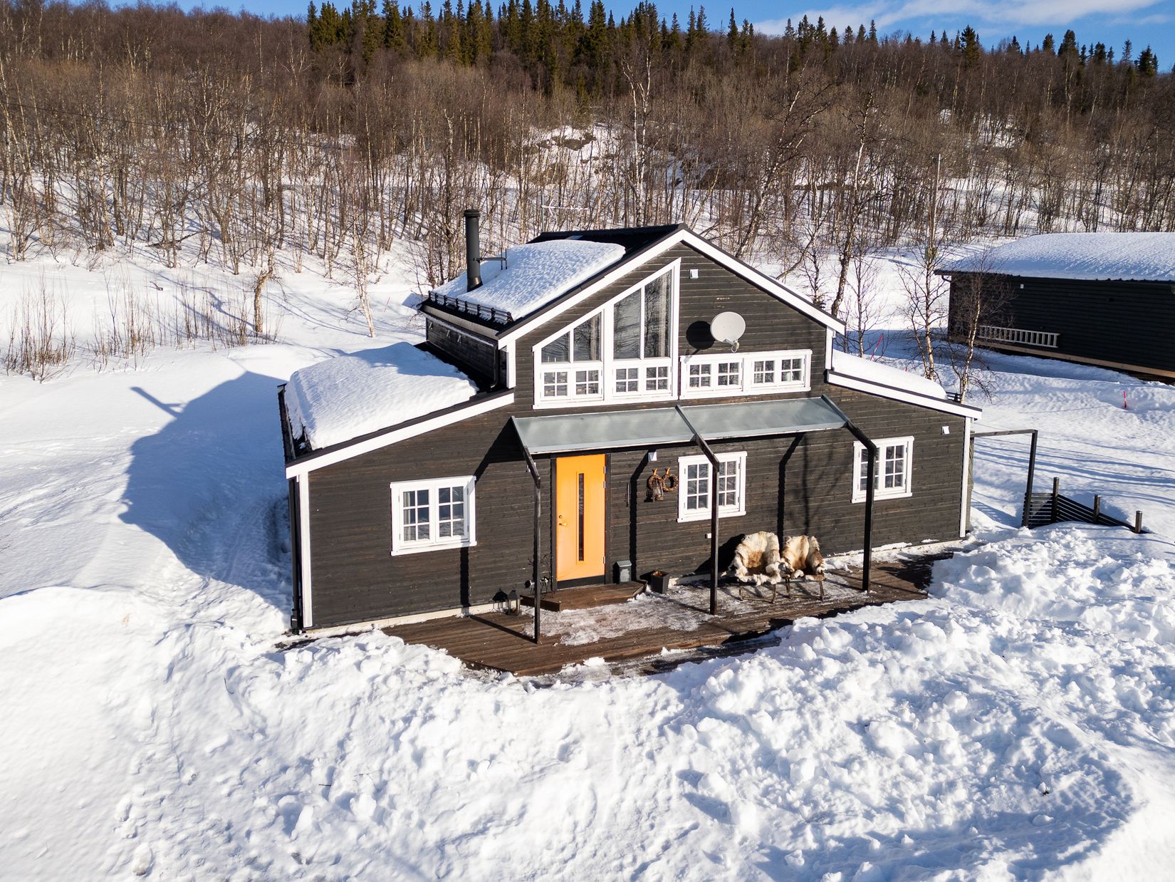 Med ett högt och fritt läge öppnar sig en storslagen vy över både sjö och fjäll, där landskapet breder ut sig utan avbrott och skapar en känsla av total närhet till naturen. Här bor du i direkt anslutning till vildmarken, med ett skyddat och privat läge där vägen leder hela vägen fram. Skoterleden passerar i närheten, liksom möjligheterna till fiske och jakt, och endast några minuter bort väntar slalombacken. I söder reser sig Autjoklimpen med sina 1240 meter och bildar en mäktig fond som ständigt är närvarande.