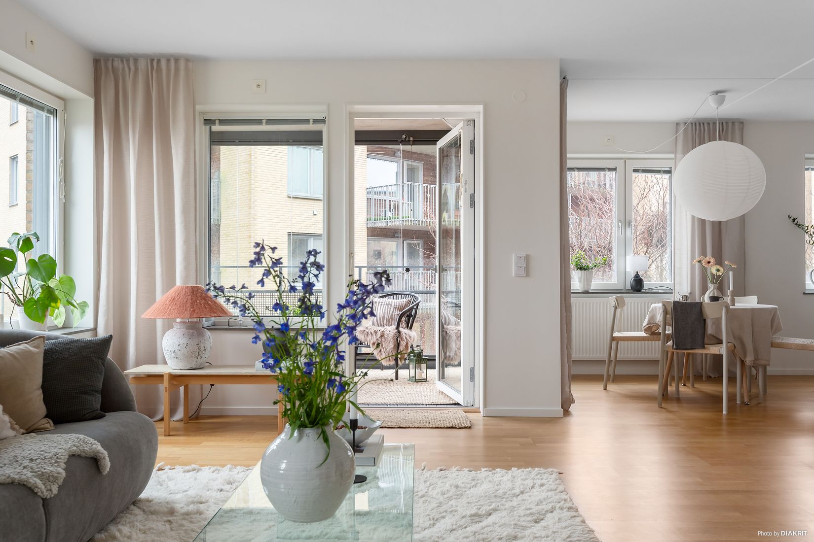 Från vardagsrummet nås den rymliga inglasade balkongen som fungerar som ett extra rum under stora delar av året. Här kan du njuta av morgonkaffet, läsa en bok i lugn och ro eller umgås med vänner i en skyddad och trivsam miljö – en perfekt plats för avkoppling oavsett årstid.