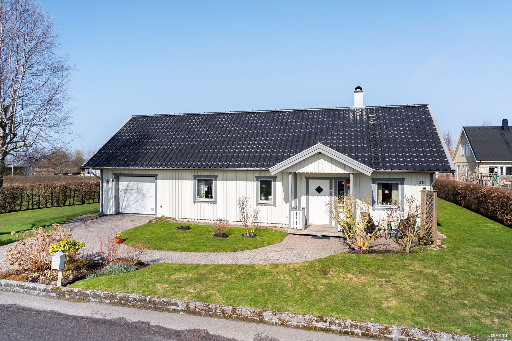 Trädgården är trevlig och lättskött med fina möjligheter till både lek, odling och avkoppling, och på ena sidan gränsar tomten mot grönområde.