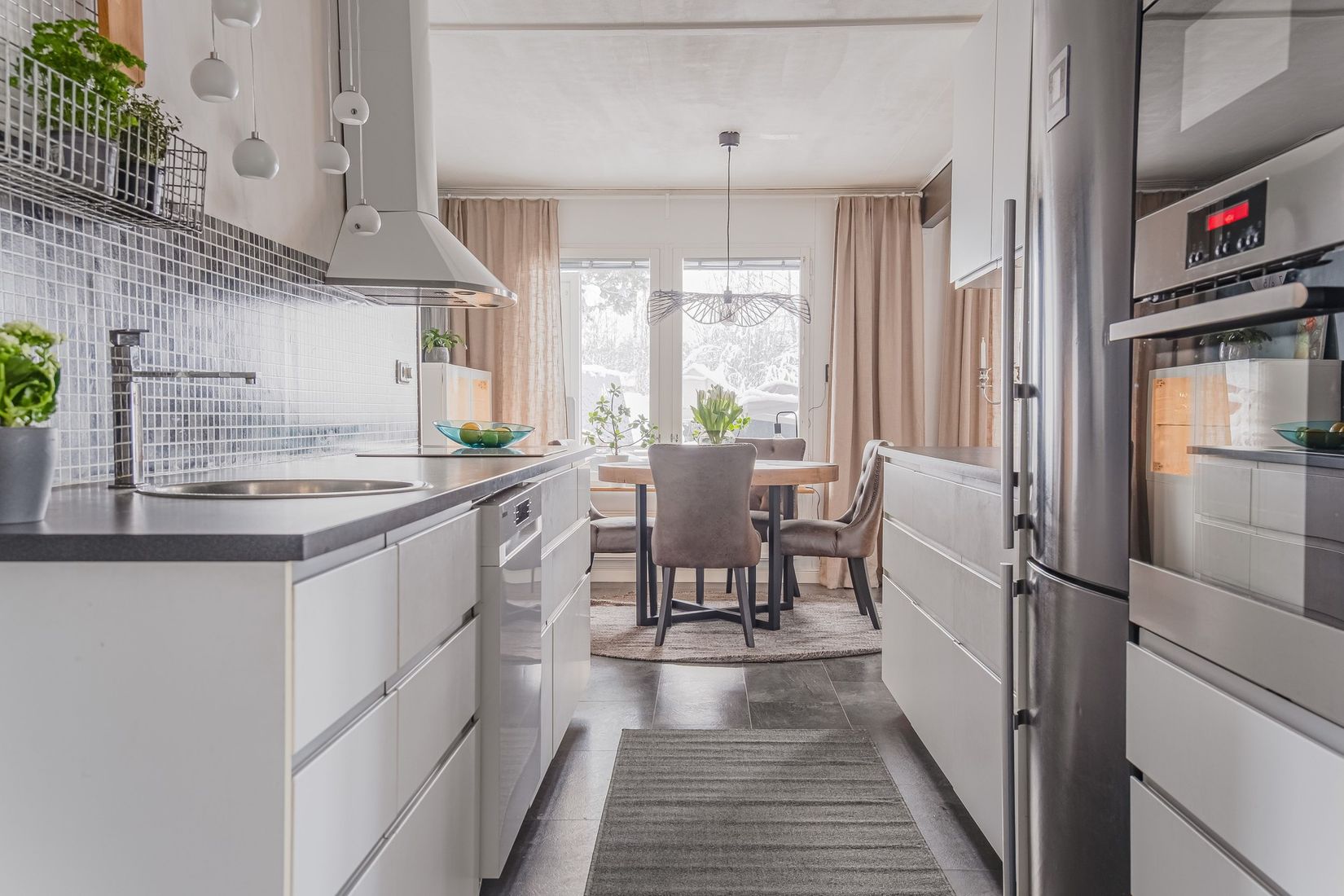 Entréplan har genomgående ljusa ytskikt, öppen planlösning mellan kök/matplats och vardagsrum för att kunna samla familj och vänner. Från vardagrummet når du utgången till altan under tak med öppning mot gården. I vardagsrummet finns även en kamin för extra mysig atmosfär och hemtrevnad.