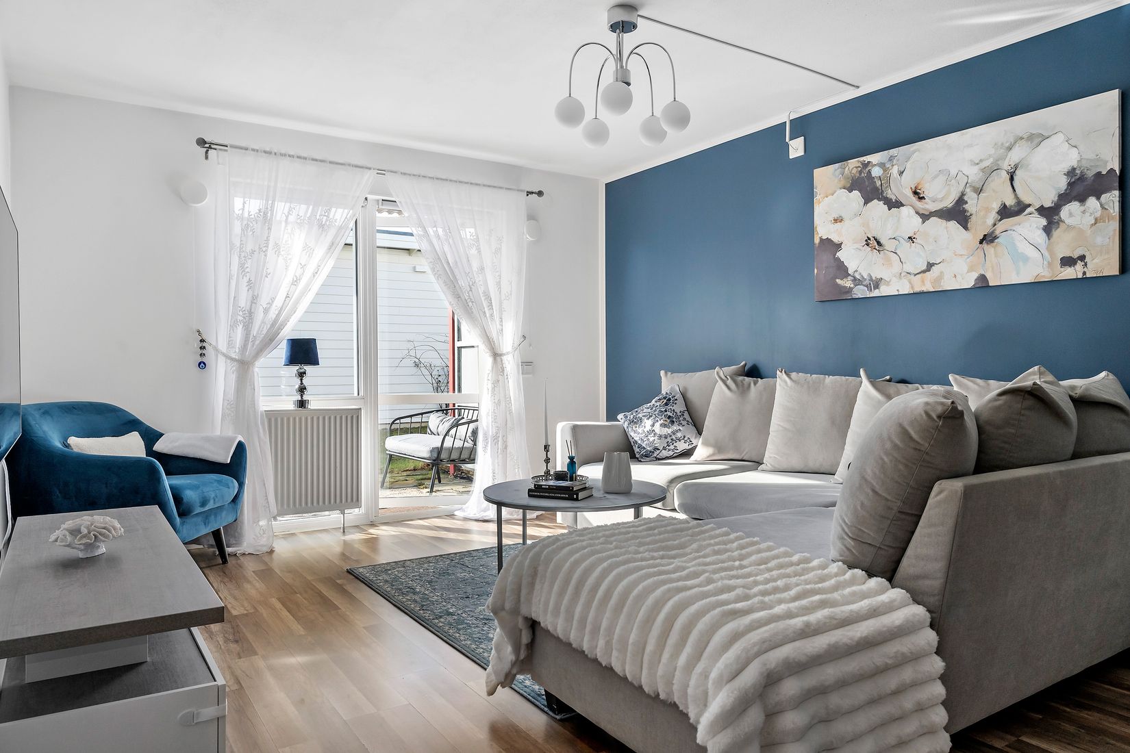 Vardagsrummet är rymligt och lättmöblerat med plats för både soffgrupp och mediamöbel. Den smakfulla fondväggen ger rummet karaktär och tillsammans med de stora fönsterpartierna skapas en varm och inbjudande känsla. Härifrån nås även bostadens uteplats där du kan njuta av lugna stunder utomhus.
