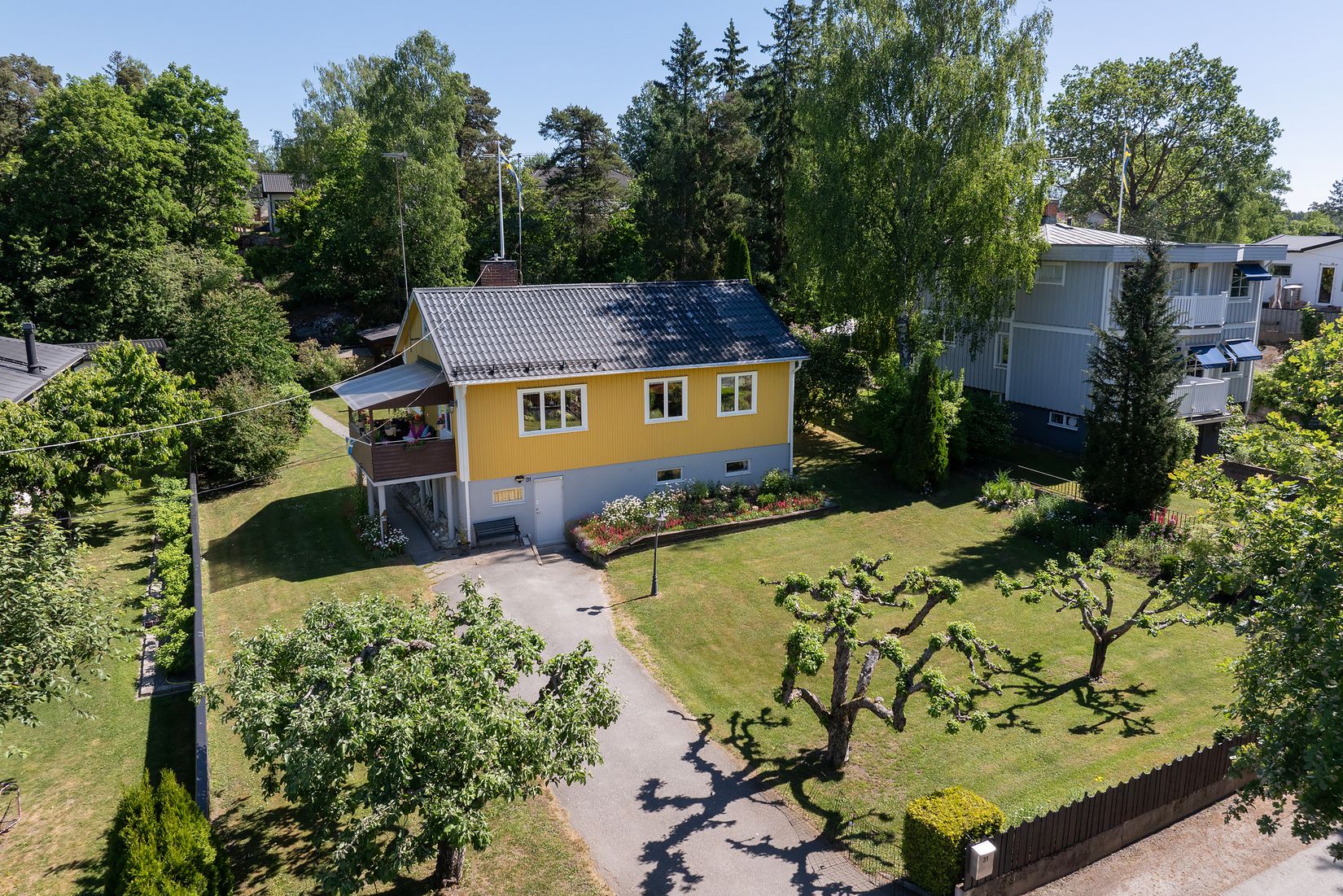 Huset är omgivet av en riktig drömträdgård där plana gräsytor blandas med lite kuperade bergspartier i kombination med diverse vackra växter och blomster. Givetvis finns det gott om plats för lek och bus för de mindre.