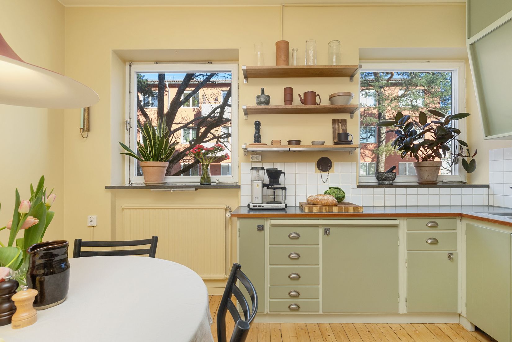 Bostaden erbjuder ett fint ljusinsläpp, genomgående slipade originalplankgolv (2019) och ett kök där den tidstypiska charmen verkligen kommer till sin rätt. Här finns originalstommar med omlackade luckor från 2024 samt flera bevarade detaljer från byggåret såsom beslag, ventilationslucka och kryddhylla. Badrummet renoverades 2019 och är utrustat med tvättmaskin och golvvärme.