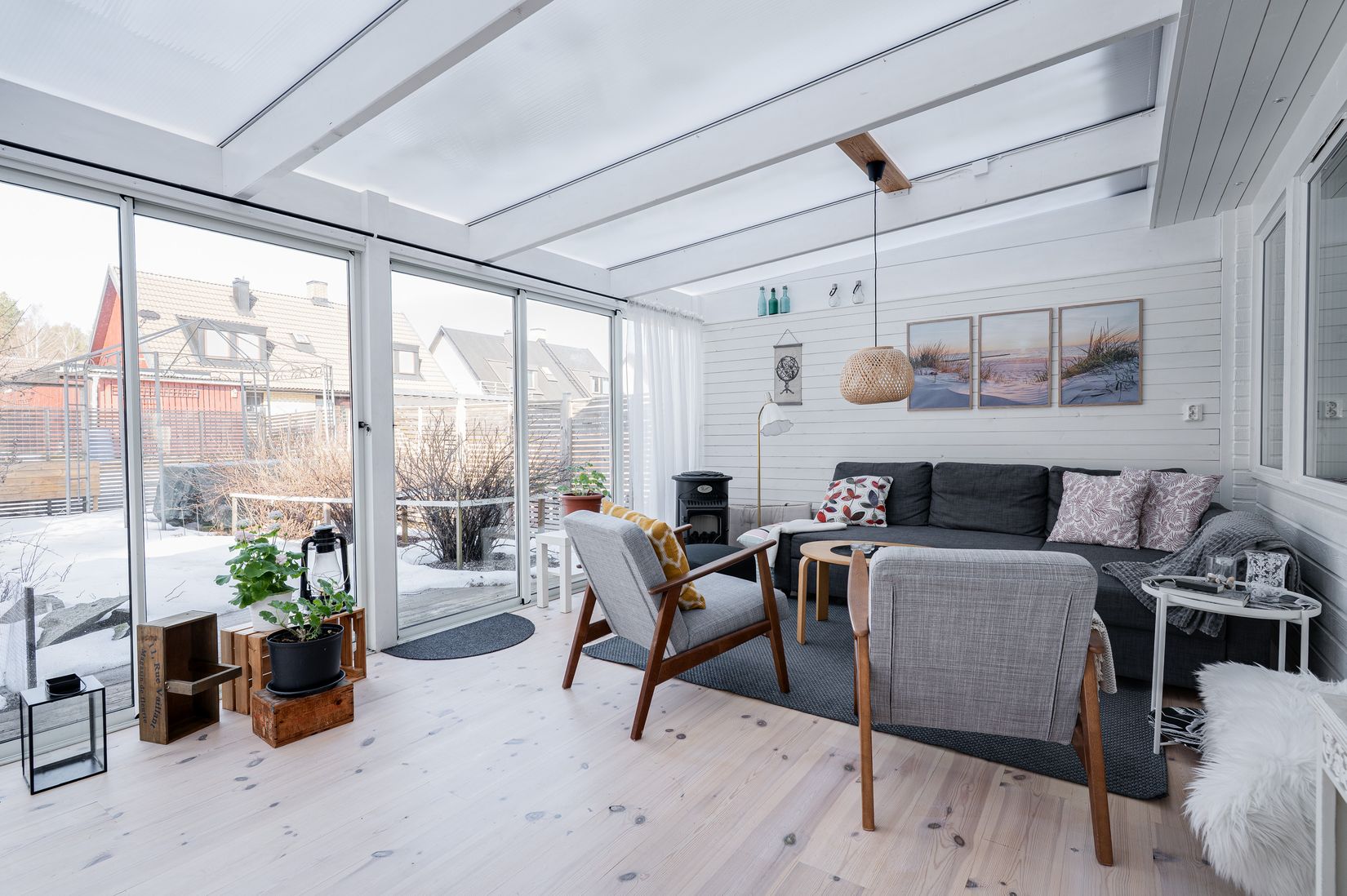 Bottenvåningen har öppen planlösning mellan kök och vardagsrum, ett sovrum och ett badrum, medan övervåningen rymmer tre sovrum, ett allrum och ytterligare ett badrum – perfekt för barnens egna rum och lekytor. Den inglasade uterummet från 2019 förlänger utomhussäsongen och blir en naturlig samlingsplats för hela familjen.