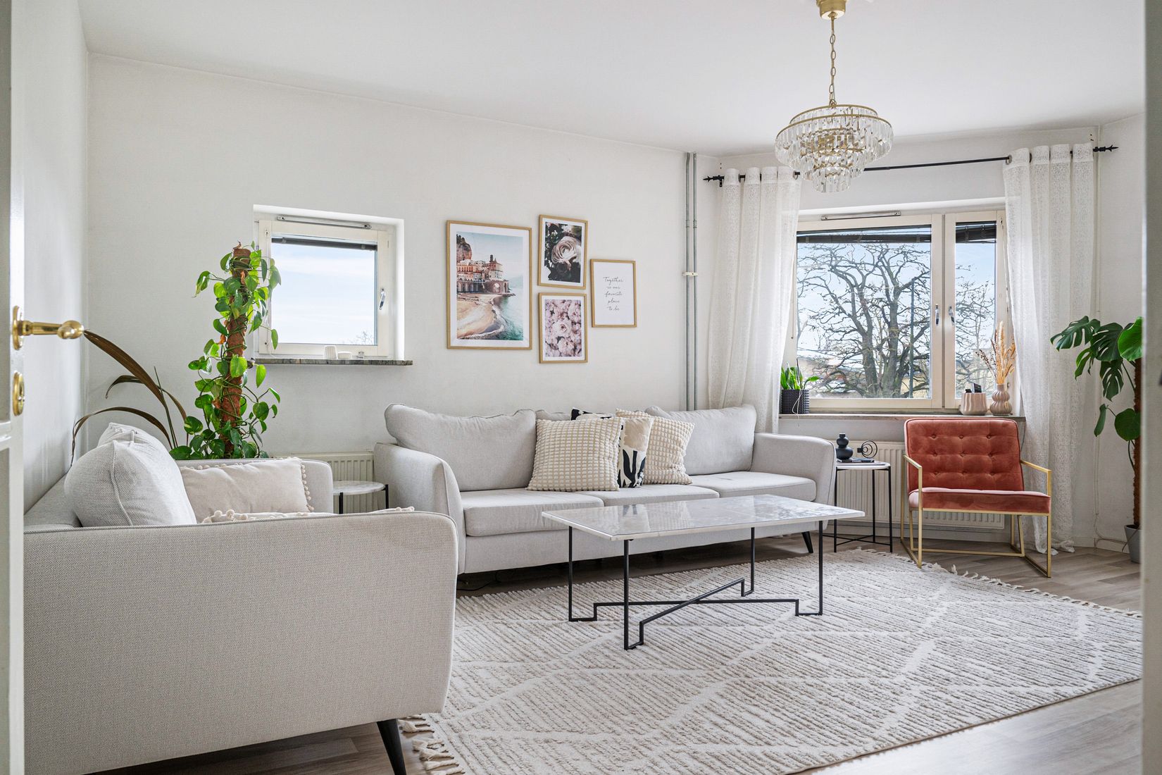 Bostaden erbjuder två rymliga sovrum samt generösa sociala ytor som lämpar sig utmärkt för både vardagsliv och umgänge. Det stora köket har gott om arbetsytor, bra förvaringsmöjligheter och plats för ett rejält matbord – en naturlig samlingspunkt i hemmet. Det moderna badrummet är smakfullt renoverat med stilrena materialval.
