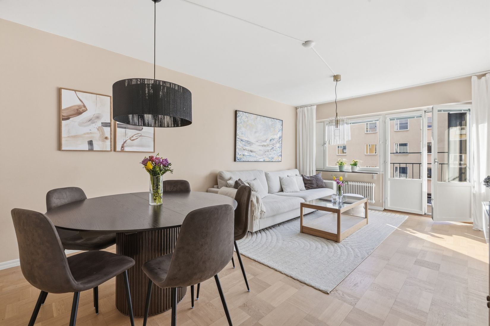 De generösa ytorna ger en luftig känsla och möjliggör flexibel möblering efter behov. Härifrån nås även bostadens franska balkong.