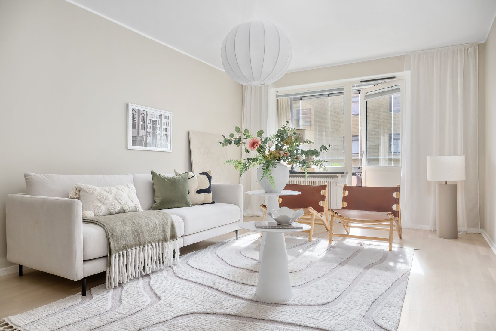 Lägenheten erbjuder ett trivsamt kök med plats för matgrupp, ett generöst sovrum, ett stilrent helkaklat duschrum utrustat med både tvättmaskin och torktumlare samt ett luftigt vardagsrum. Hallen är praktiskt utformad med flera inbyggda garderober som ger gott om förvaring.