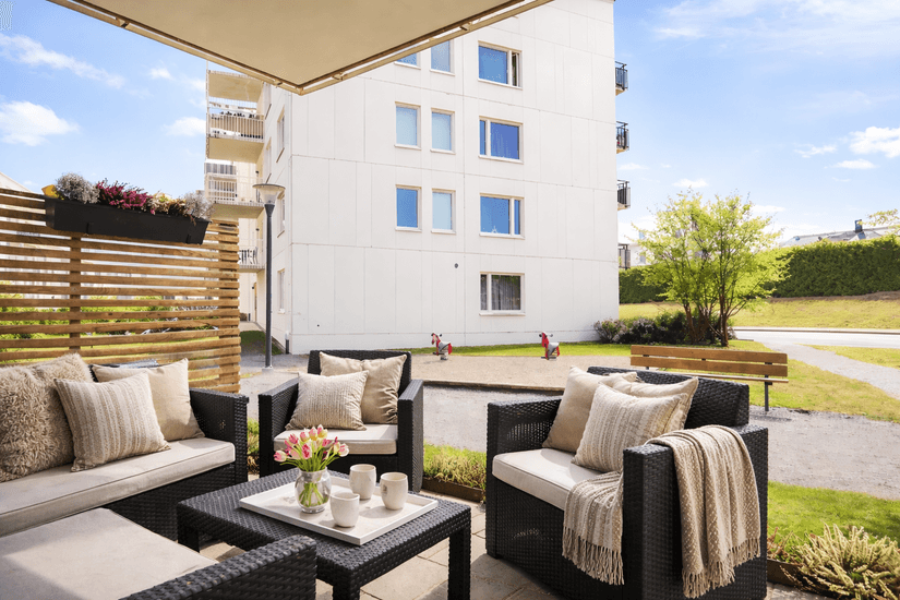En härlig uteplats i markplan ger perfekt plats för avkoppling, middagar utomhus eller bara skönt häng på sommarkvällar.