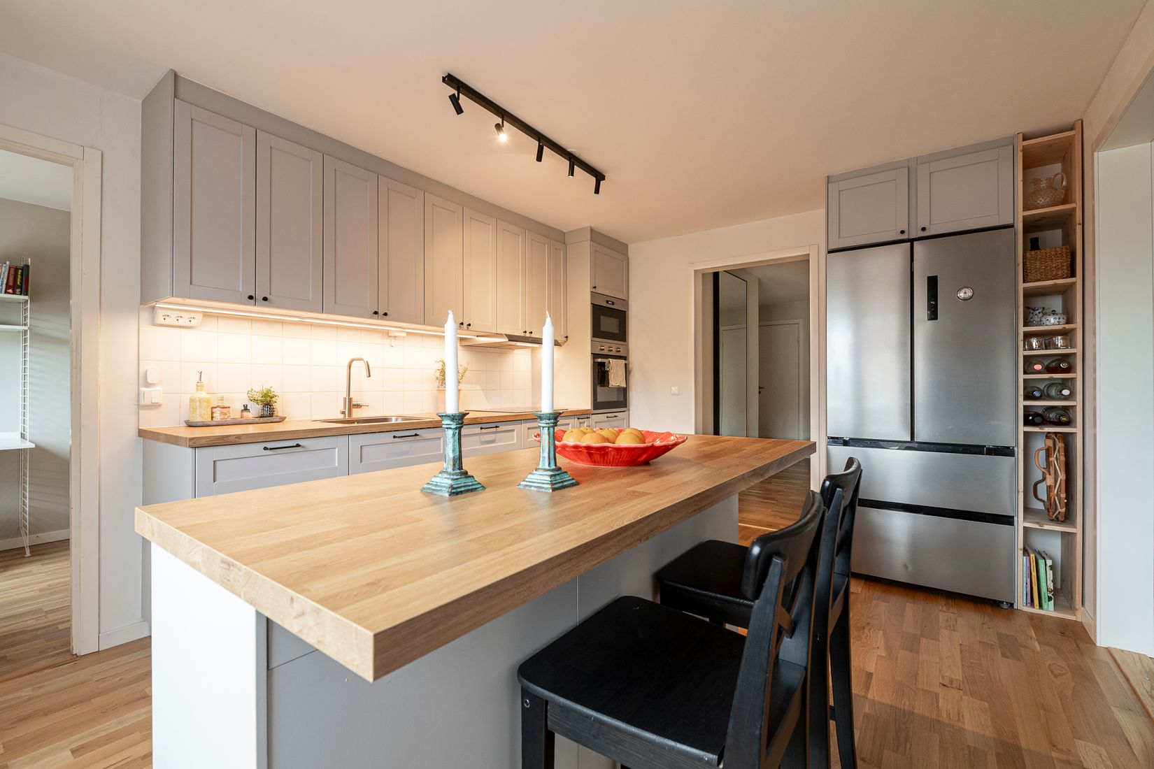 Vardagsrummet är luftigt och inbjudande med fina sällskapsytor och plats för större möblemang. Köket är modernt och funktionellt med goda arbetsytor och bra förvaring, perfekt för både vardag och sociala tillställningar.
