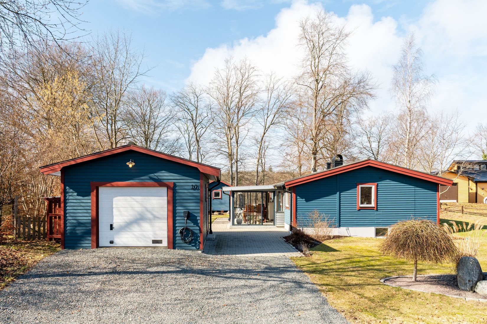 Fristående garagebyggnad som rymmer både en bil samt förvaring. Vid garagets framsida finns elbilsladdare installerad.