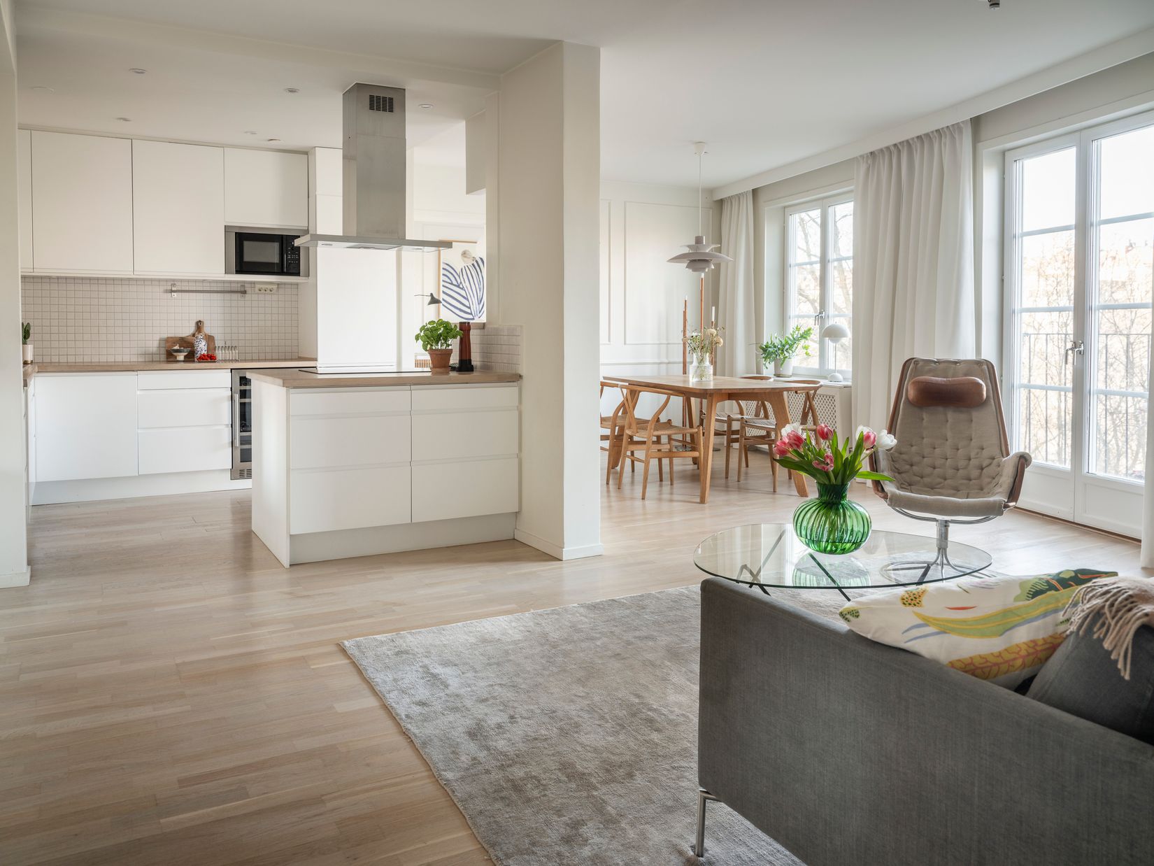 Redan i entrén möts ni av en ljus och välkomnande hall med platsbyggd förvaring och ett genomgående parkettgolv som elegant binder samman bostadens alla delar. Vidare öppnar bostaden upp sig i ett luftigt vardagsrum där stora fönsterpartier skapar ett naturligt ljusflöde och förstärker känslan av rymd. Här ryms både en generös soffgrupp och en social matsalsdel, vilket gör rummet till hemmets självklara samlingspunkt. Platsbyggda bokhyllor med integrerad belysning och diskreta ljuskornischer i taket bidrar till en tydlig premiumkänsla. Från vardagsrummet nås en av bostadens balkonger via dubbla glasdörrar.