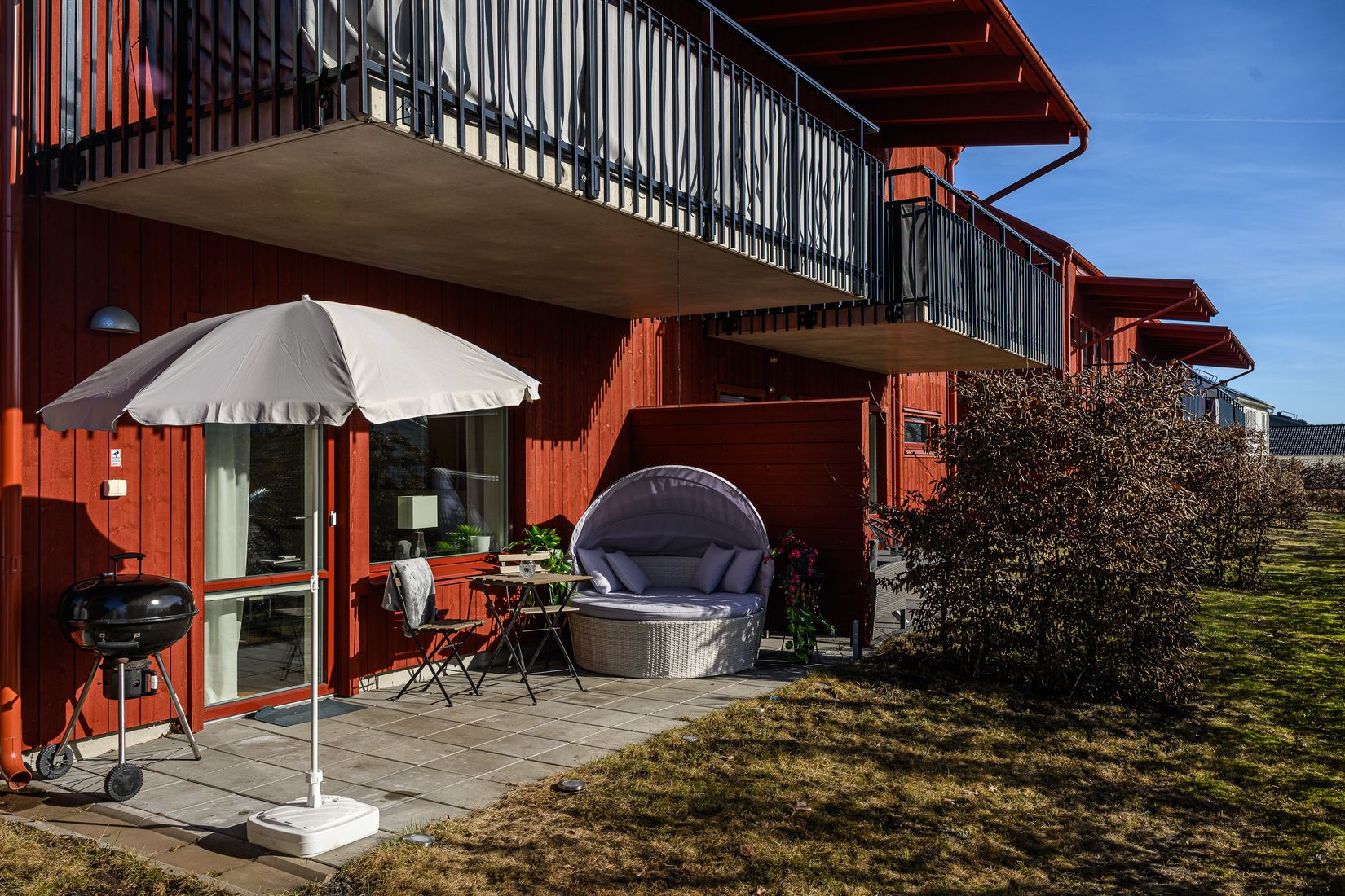 Planlösningen är tilltalande och fördelas över ca 72,2 kvm. Kök och vardagsrum förenas i en öppen planlösning och bildar en härlig social samlingsplats. Modernt och fullutrustat kök med bland annat rostfria vitvaror och spotlights under överskåp. Luftigt och ljust vardagsrum med utgång till den stensatta uteplatsen. Vidare finns här ett påkostat, helkaklat badrum med skön golvvärme och spotlights i taket. I badrummet finns även tvättmaskin, torktumlare, tvättho och förvaringsskåp. Trivsamt sovrum med bra förvaringsmöjlgjheter i en stor skjutdörrsgarderob. Fina förvaringsmöjligheter i flera garderober i hallen. Till lägenheten hör en parkeringsplats samt ett utvändigt förråd.
