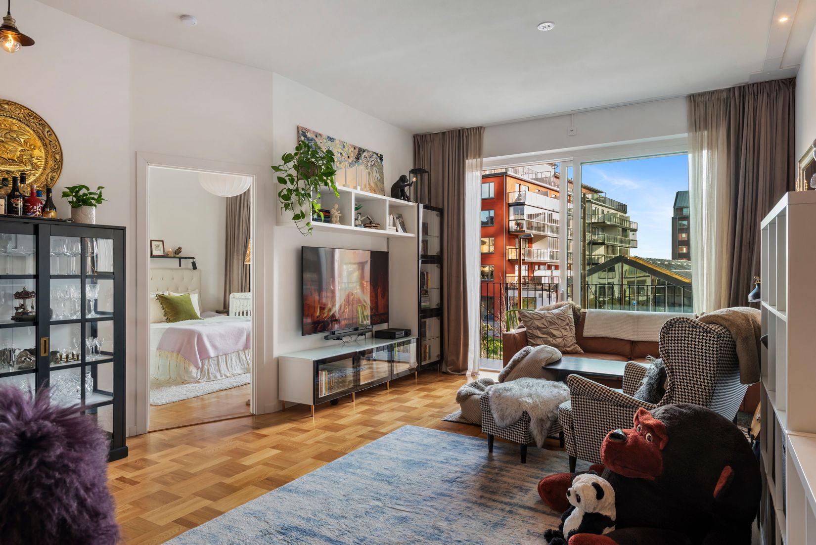 Välkommen till denna moderna och välplanerade trea om 87 kvm på andra våningen med ett fantastiskt läge på Rederigatan 1. Här bor du med utsikt över en grönskande park i ett av Norrtäljes mest eftertraktade områden. Bostaden präglas av generösa fönsterpartier som släpper in rikligt med naturligt ljus. Morgonsolen strömmar in i både vardagsrum och sovrum och skapar en ljus och behaglig atmosfär redan från dagens första timmar. Den öppna planlösningen mellan kök och vardagsrum ger en social och luftig känsla, förstärkt av den imponerande takhöjden om cirka tre meter. Här finns gott om plats för både soffgrupp och matplats. Köket från Marbodal är stilrent och funktionellt utformat med bra arbetsytor och god förvaring, perfekt för både vardag och middagar med vänner. Från vardagsrummet nås den breda balkongen som löper längs både vardagsrum och sovrum. Balkongen är cirka 70 cm djup och den blir den en härlig plats för växter, morgonkaffe eller en stund i solen med utsikt över parken. Vid lägenhetens entre finns en till balkong med plats för en mindre lounge grupp. Lägenheten erbjuder två sovrum. Det större sovrummet har plats för dubbelsäng och är utrustat med garderober. Det andra sovrummet rymmer en 120-säng samt förvaring och fungerar utmärkt som barnrum, gästrum eller hemmakontor. Det helkaklade duschrummet är utrustat med både tvättmaskin och torktumlare från Miele för en bekväm vardag. Dessutom finns en praktisk klädkammare med garderober som ger extra förvaringsmöjligheter. Genom hela bostaden löper ett vackert parkettgolv och vid entrén finns stilren klinker. Golvvärme i hela lägenheten ger en behaglig komfort året om.