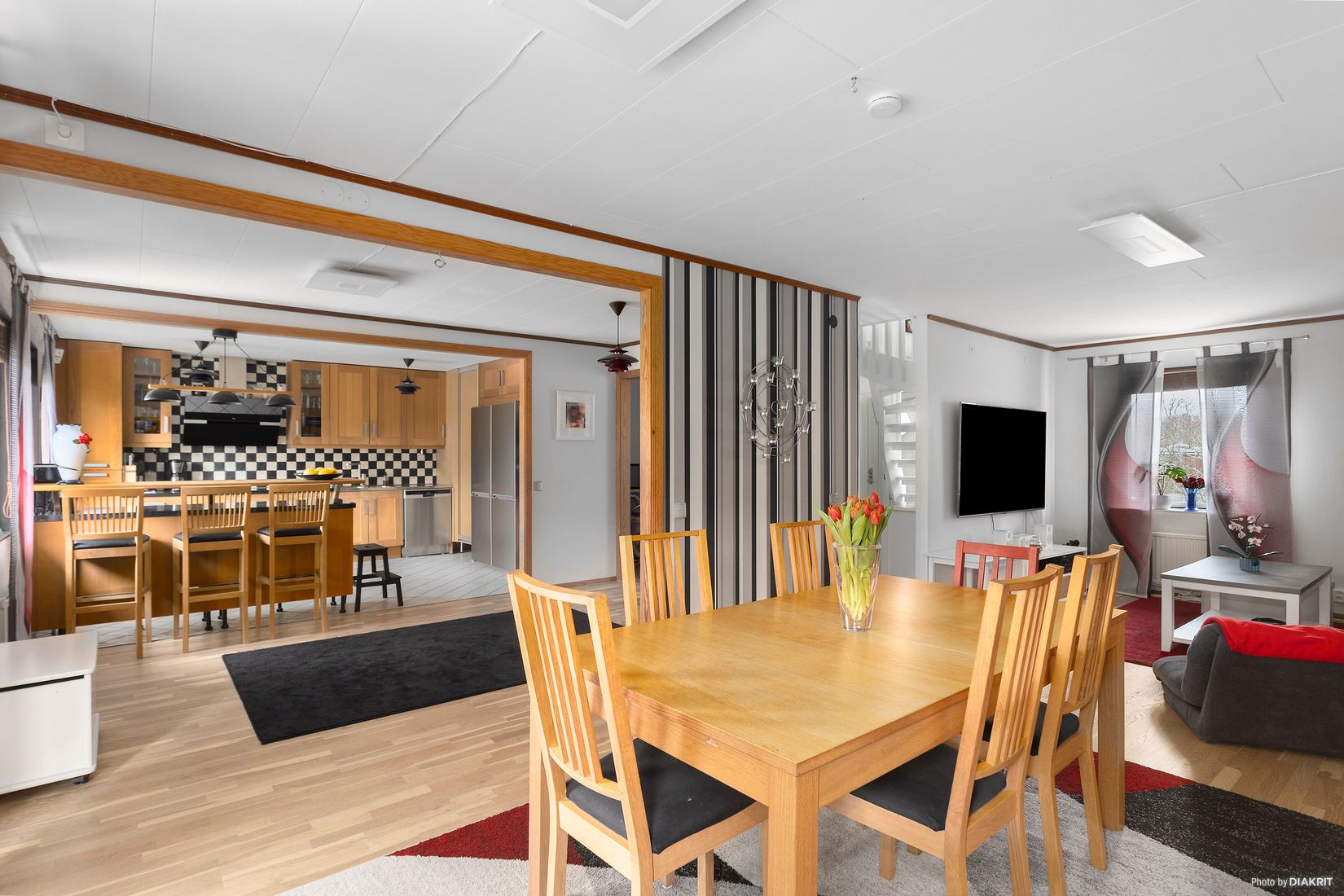 Entréplan med social planlösning. Vardagsrum/matsal/kök med öppen planlösning och med utgång till uteplats i skyddat österläge.