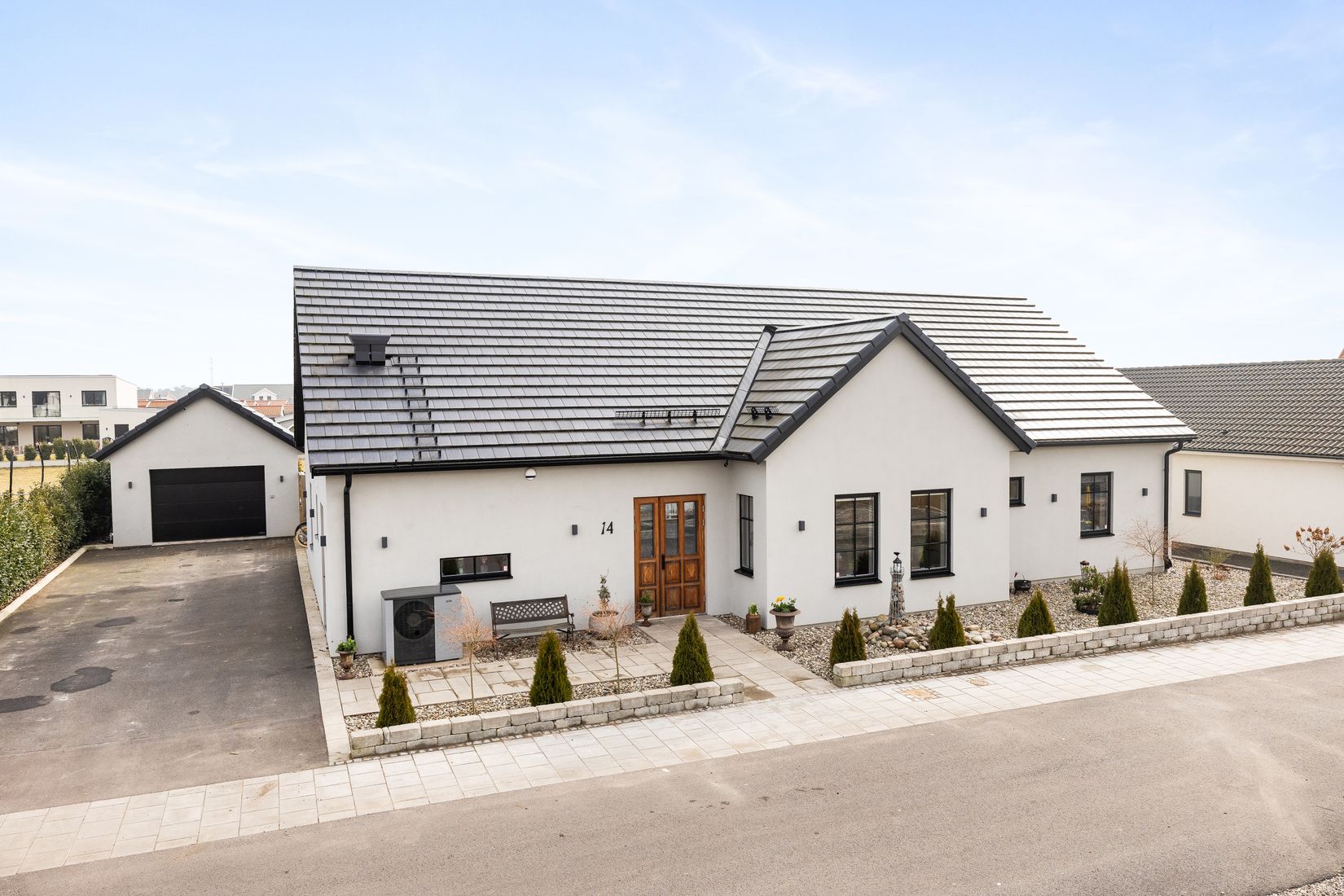Redan vid entrén möts ni av en välskött och inbjudande framsida med stenlagda gångar, prydliga planteringar och en harmonisk helhet. Den separata garagebyggnaden tillsammans med en rymlig uppfart skapar både praktiska parkeringsmöjligheter och gott om förvaringsutrymme.