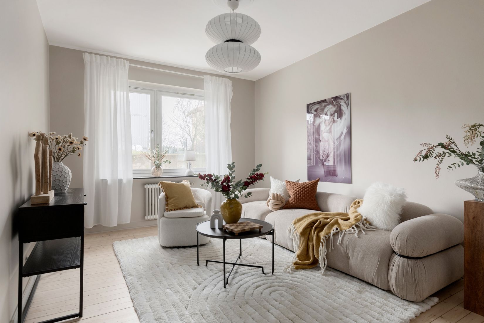Välkommen in i en ljus och välkomnande hall som ger ett fint första intryck av bostaden. Här möts du av en harmonisk färgsättning och vackra framtagna brädgolv som bidrar till en varm och trivsam känsla. Hallen erbjuder gott om plats för avhängning av ytterkläder och skor, vilket gör den både praktisk och funktionell.