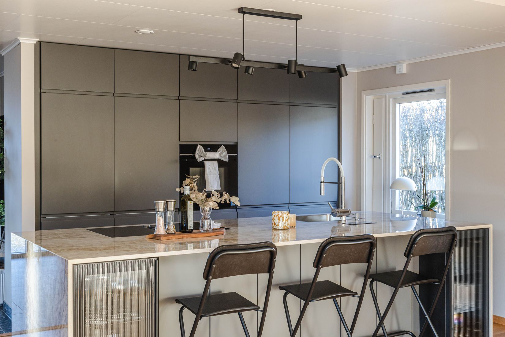 Husets naturliga mittpunkt är det eleganta köket, där en generös köksö skapar en social och inbjudande samlingsplats. Här kombineras design och funktion på bästa sätt med en exklusiv stenskiva från Dekton och högkvalitativa vitvaror från Neff. Köket övergår sömlöst i de öppna sällskapsytorna, vilket skapar en luftig planlösning perfekt för både vardag och umgänge.