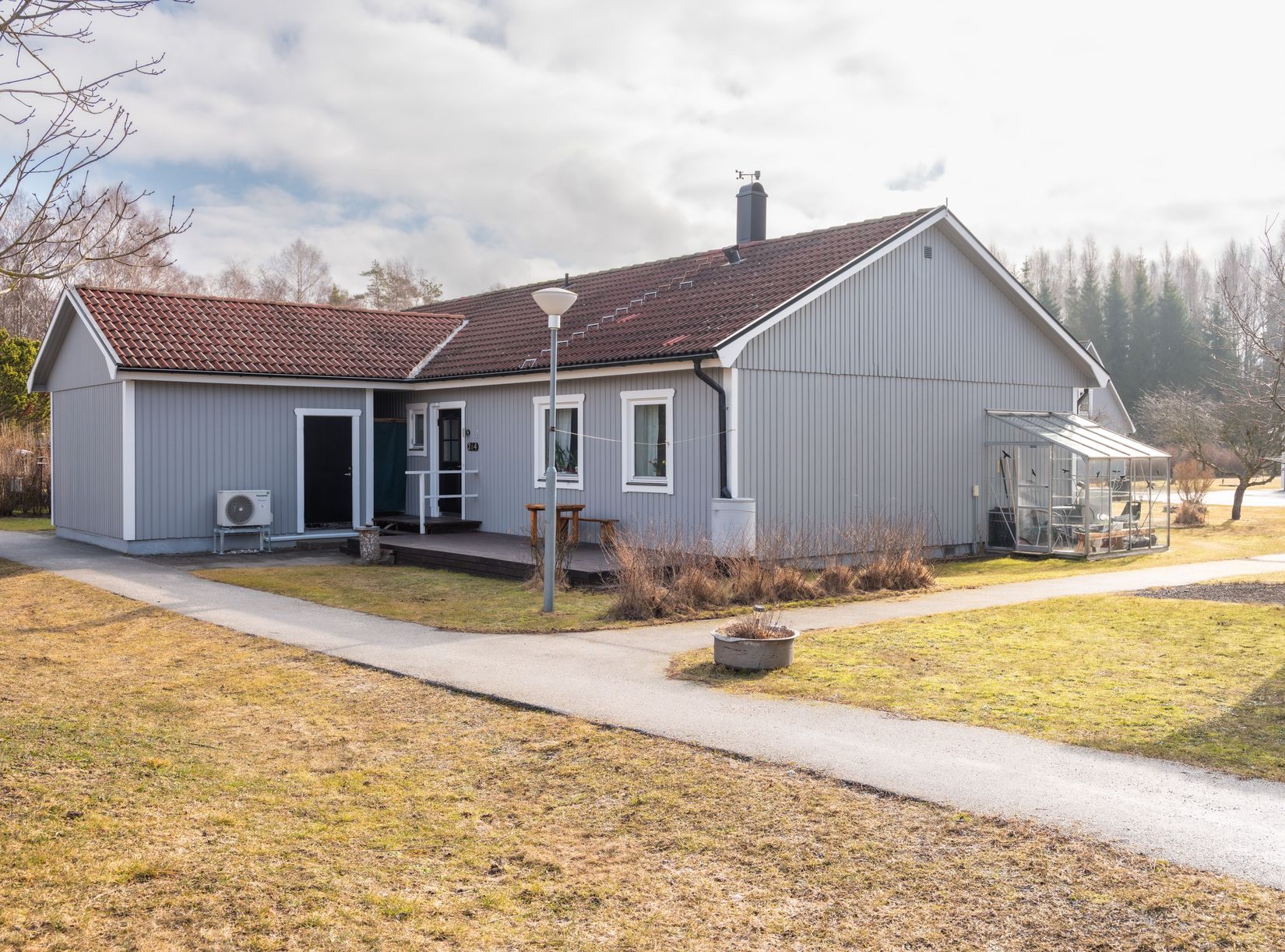 Vid entrén finns ytterligare en uteplats i norrläge samt ett tillhörande förråd, vilket ger bra förvaring och en naturlig plats för exempelvis redskap eller trädgårdsmöbler. På husgaveln finner man även ett växthus för odling och rekreation.