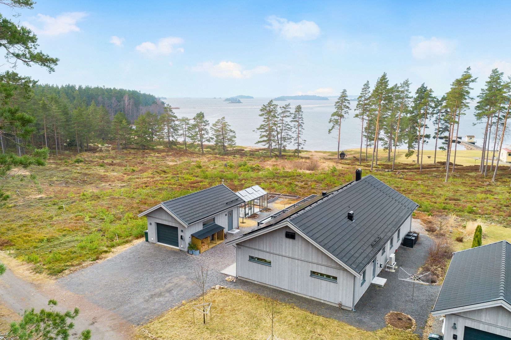 Husets exteriör präglas av en fasad behandlad med Sioo:x, vilket ger en elegant silvergrå ton och lång hållbarhet. Taket är försett med betongpannor samt solceller som tillsammans med ett installerat batteri om 10 kWh möjliggör lagring av egenproducerad el – en smart lösning som optimerar energianvändningen och bidrar till låga driftkostnader.