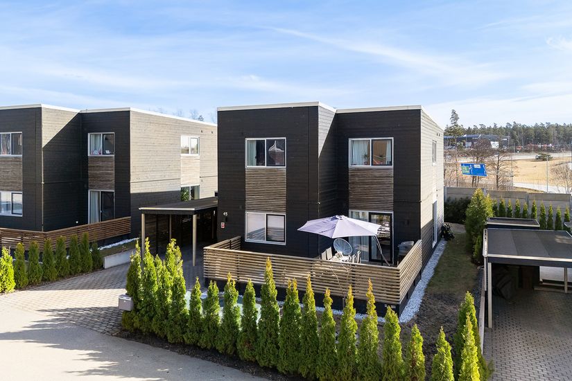 Välkommen till Stäkshöjden och ett bostadsrättshus om 123 kvm i två plan med svart träfasad och dansk formgivning. Sedan huset byggdes 2016 har det fått en helt ny utomhusmiljö - med nedsänkt spabad, utbyggd altan på både fram- och baksida och fullständigt insynsskydd - tillsammans med en lång rad uppgraderingar invändigt.