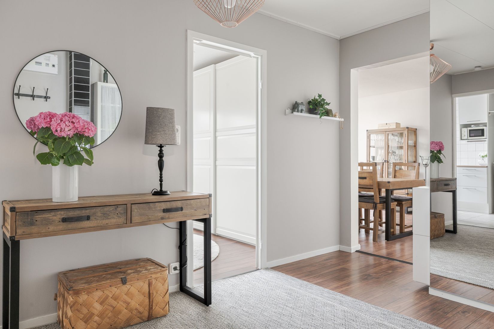 Redan när du kliver in möts du av en stor och välkomnande hall med gott om plats för avhängning och förvaring. Hallen skapar en luftig känsla och fungerar som en naturlig mittpunkt i bostaden där du enkelt når lägenhetens alla rum.