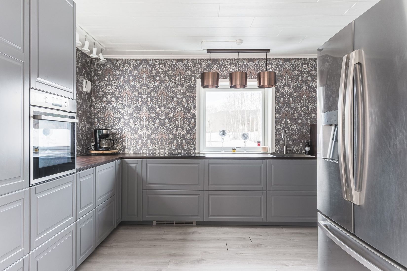 Husets hjärta är det stilfullt renoverade köket i öppen planlösning mot matrum och allrum. Här finns gott om plats för både vardag och fest, och den värmande öppna spisen bidrar till en inbjudande och hemtrevlig atmosfär året om.
