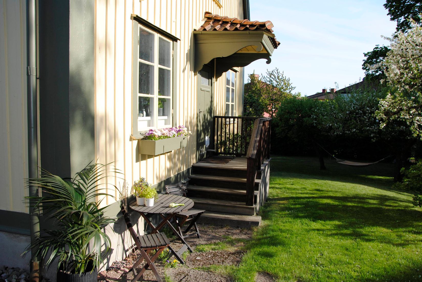 Den uppvuxna och omsorgsfullt anlagda trädgården är en grön oas med fruktträd, lummighet och flera uteplatser i olika väderstreck - här följer du solen från morgon till kväll i en privat och rofylld miljö.