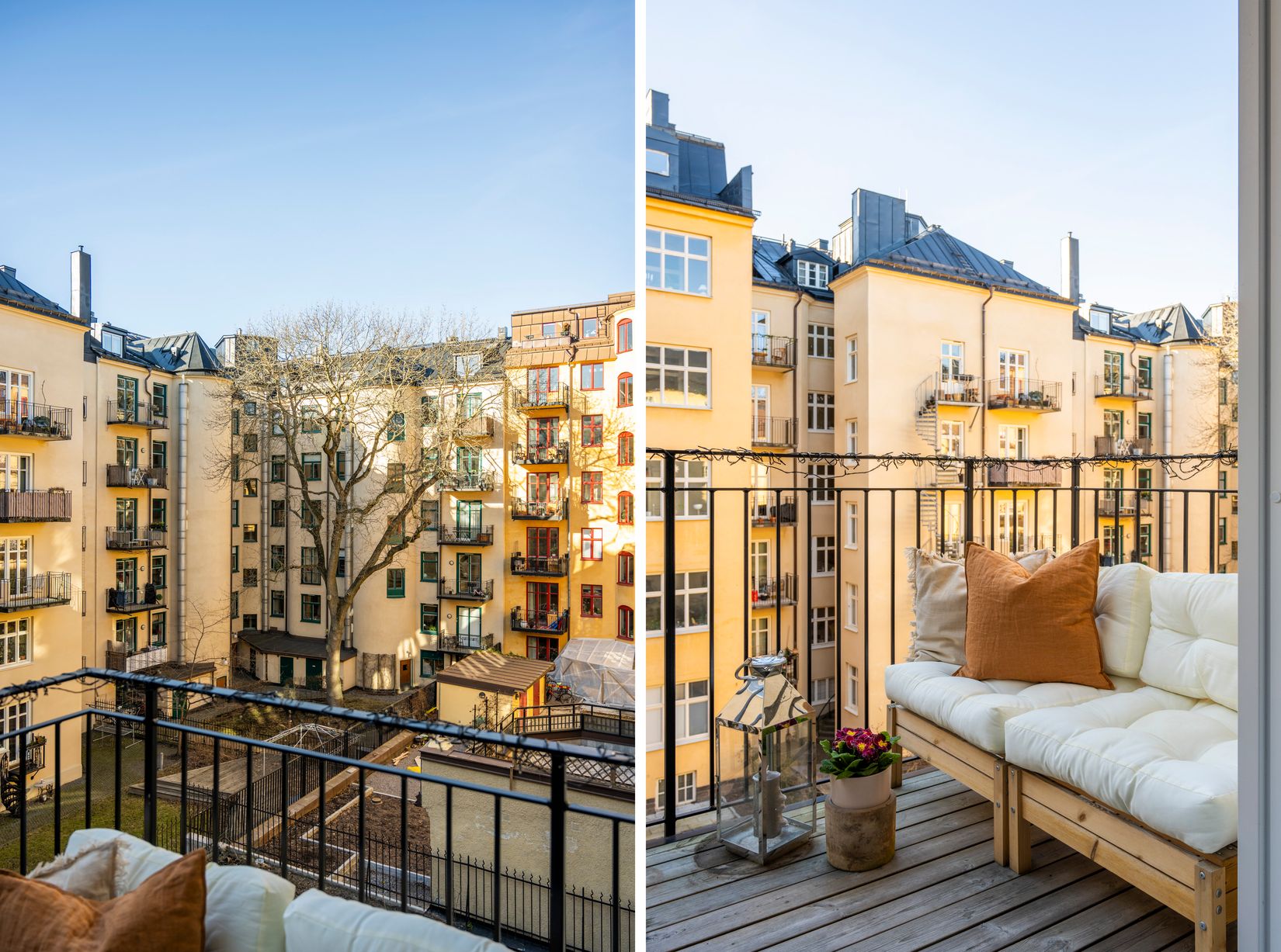 Den imponerande takhöjden om över tre meter, vacker kakelugn, stilrent behandlade trägolv och eleganta stuckaturer skapar en unik atmosfär. Från den stora, soliga balkongen mot innergården njuter du av ett rofyllt läge – samtidigt som du bor med närhet till populära Hornstull och allt området har att erbjuda.