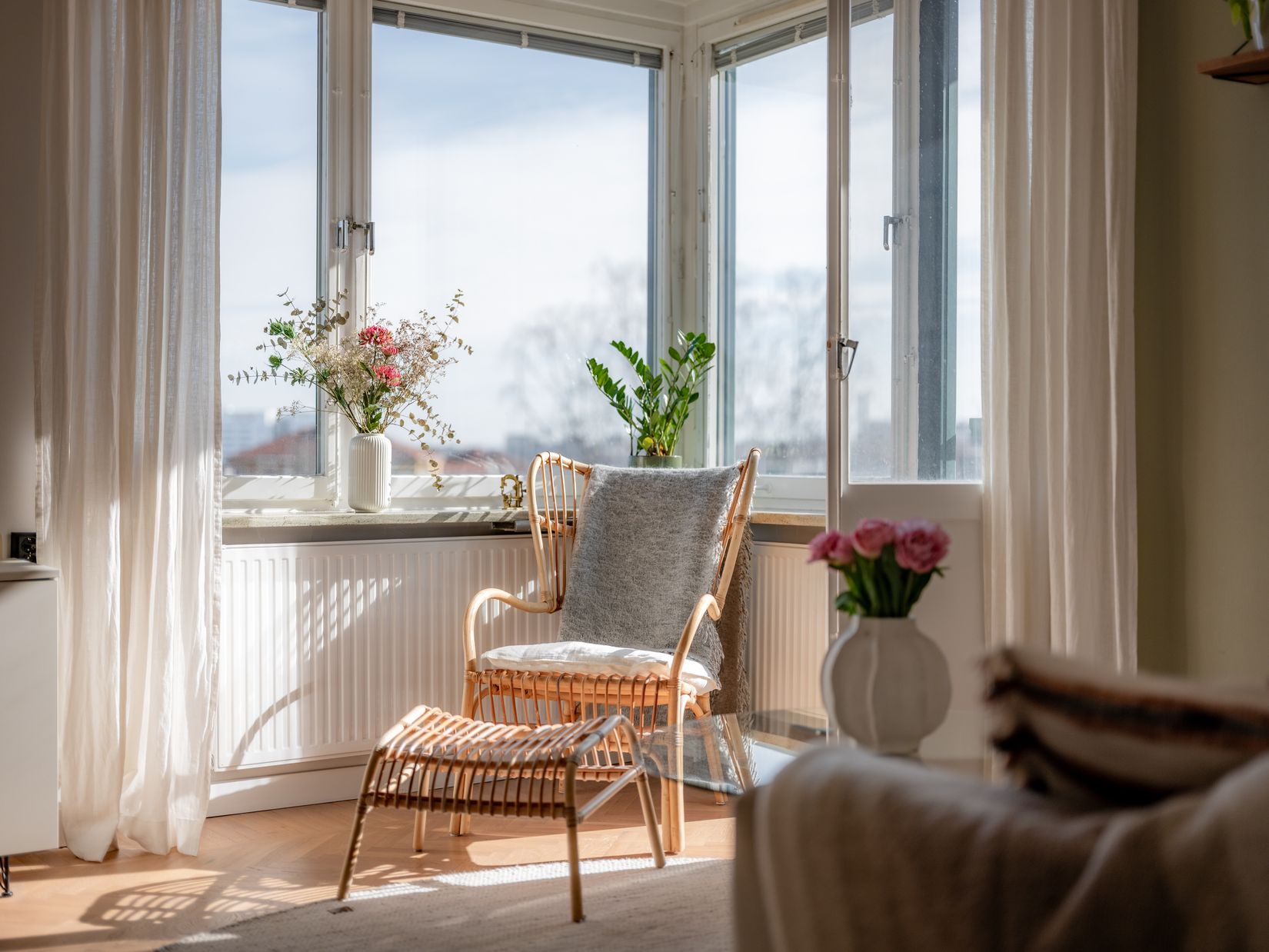Bostaden erbjuder ett rymligt vardagsrum med fönster åt två håll och utgång till den större balkongen där du kan njuta av solen större delen av dagen, samt delvis öppen planlösning mot det stilrena köket med smakfullt mörkbetsade luckor och vackra bänkskivor i tålig kompositsten. Den generösa köksön erbjuder både arbetsyta, plats att duka upp för mysiga middagar och trevligt socialt häng. Köket erbjuder också full maskinell utrustning och integrerade vitvaror samt en härlig matplats vid fönstret. Härifrån når du också bostadens andra balkong där du kan njuta av ditt kaffe i morgonsolen, eller som idag med plats för grill för härlig matlagning och enkel access till köket. Det rofyllda sovrummet är härligt ljust med stora fönster, och rymligt med plats för både dubbelsäng och arbetsplats för den som önskar. Gott om förvaring i garderober längs ena väggen. Det kaklade badrummet är ljust och smakfullt renoverat med kommod med bänkskiva i vacker kompositsten, och spotlights i taket. Här finns en kombinerad tvättmaskin med torktumlare, dusch med vikbara glasdörrar, spegelskåp med belysning, wc och handukstork. Även hallen är välkomnade med vackert golv i original i klassisk kolmårdsmarmor. Här finns gott om förvaring i flera garderober.