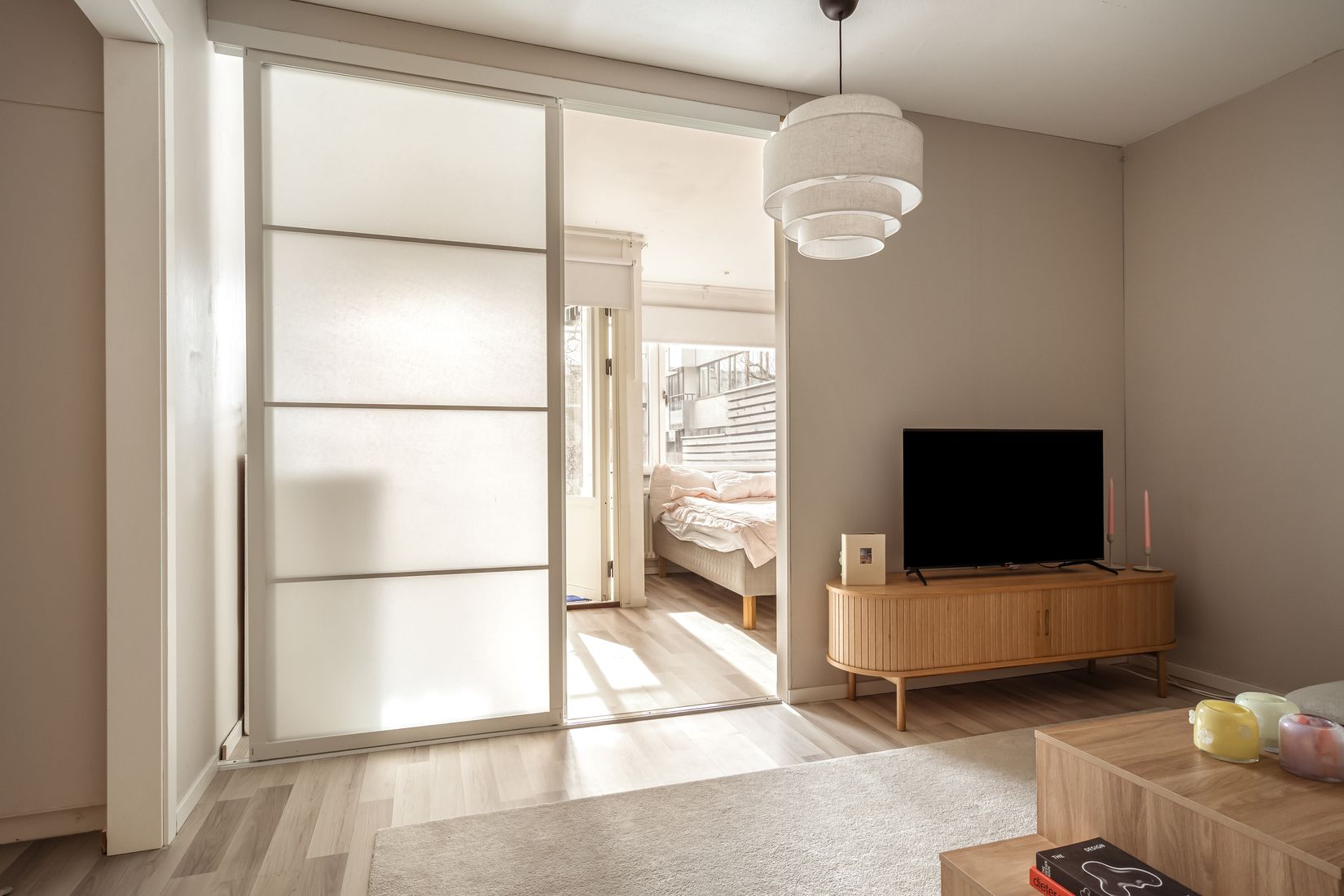 Vardagsrummet är socialt och luftigt, med flexibla lösningar i form av vägg och skjutdörrar som enkelt kan avskärma sovalkoven eller öppnas upp för att skapa en större, sammanhängande yta. Den avskilda sovalkoven rymmer utan problem en större säng och har direkt utgång till den härliga uteplatsen, ett av bostadens absoluta guldkorn. Badrummet är helkaklat, ljust och fräscht med dusch.