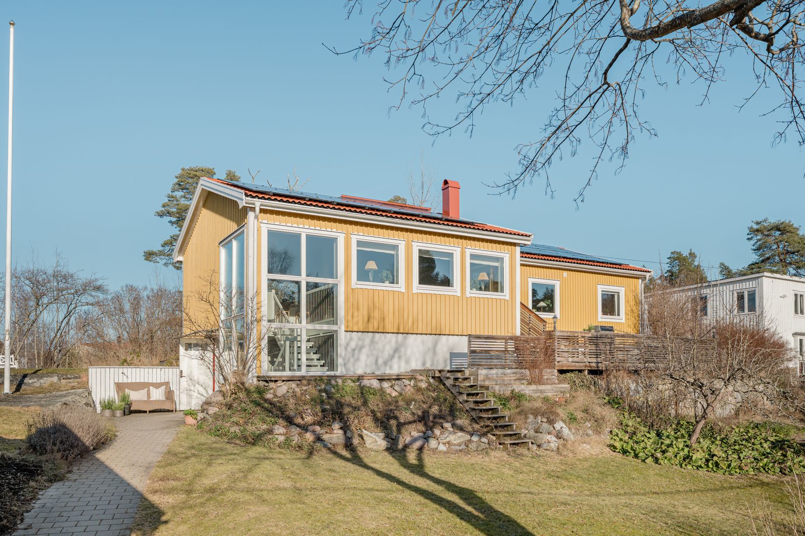Huset bjuder på en modern och tilltalande arkitektur där den varma träfasaden möter stora fönsterpartier som ger ett fantastiskt ljusinsläpp. Den generösa altanen och de inbjudande uteplatserna skapar en naturlig förlängning av bostaden och erbjuder flera soliga lägen – idealiskt för såväl vardagsliv som sociala tillställningar.