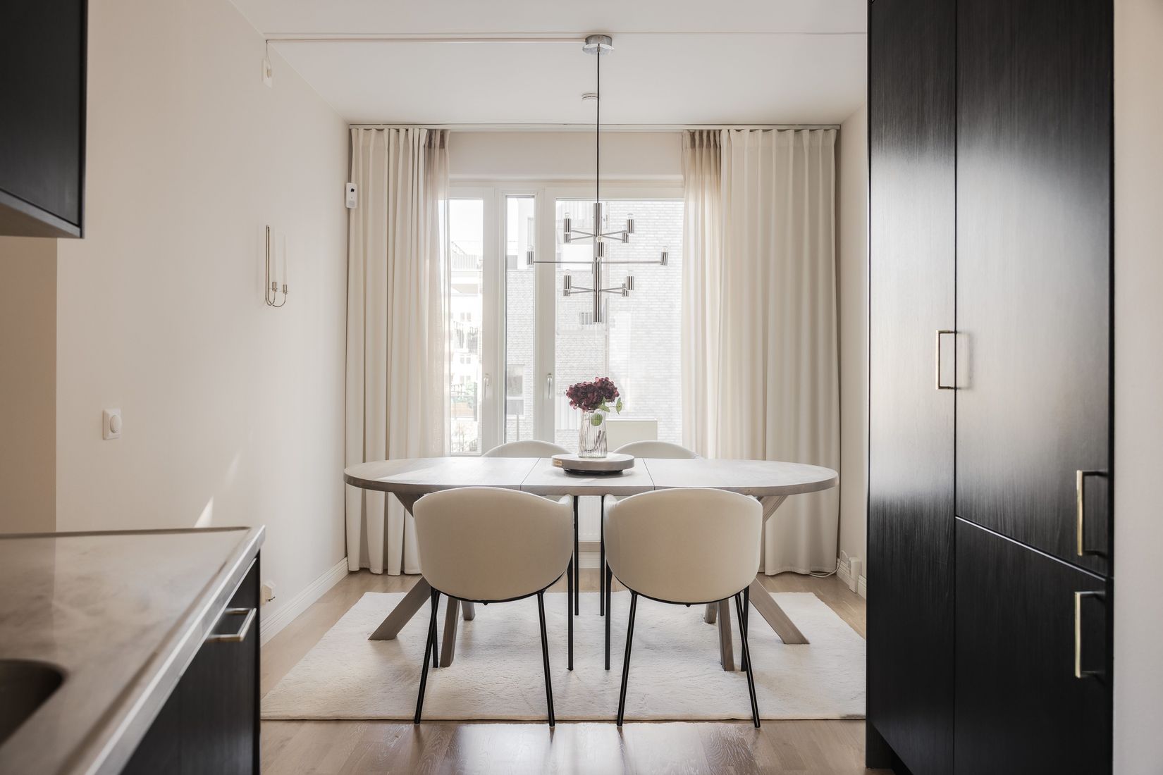 Den halvöppna planlösningen främjar en trevlig samvaro, medan de stora fönsterpartierna släpper in generöst med ljus och skapar en ljus och luftig känsla.