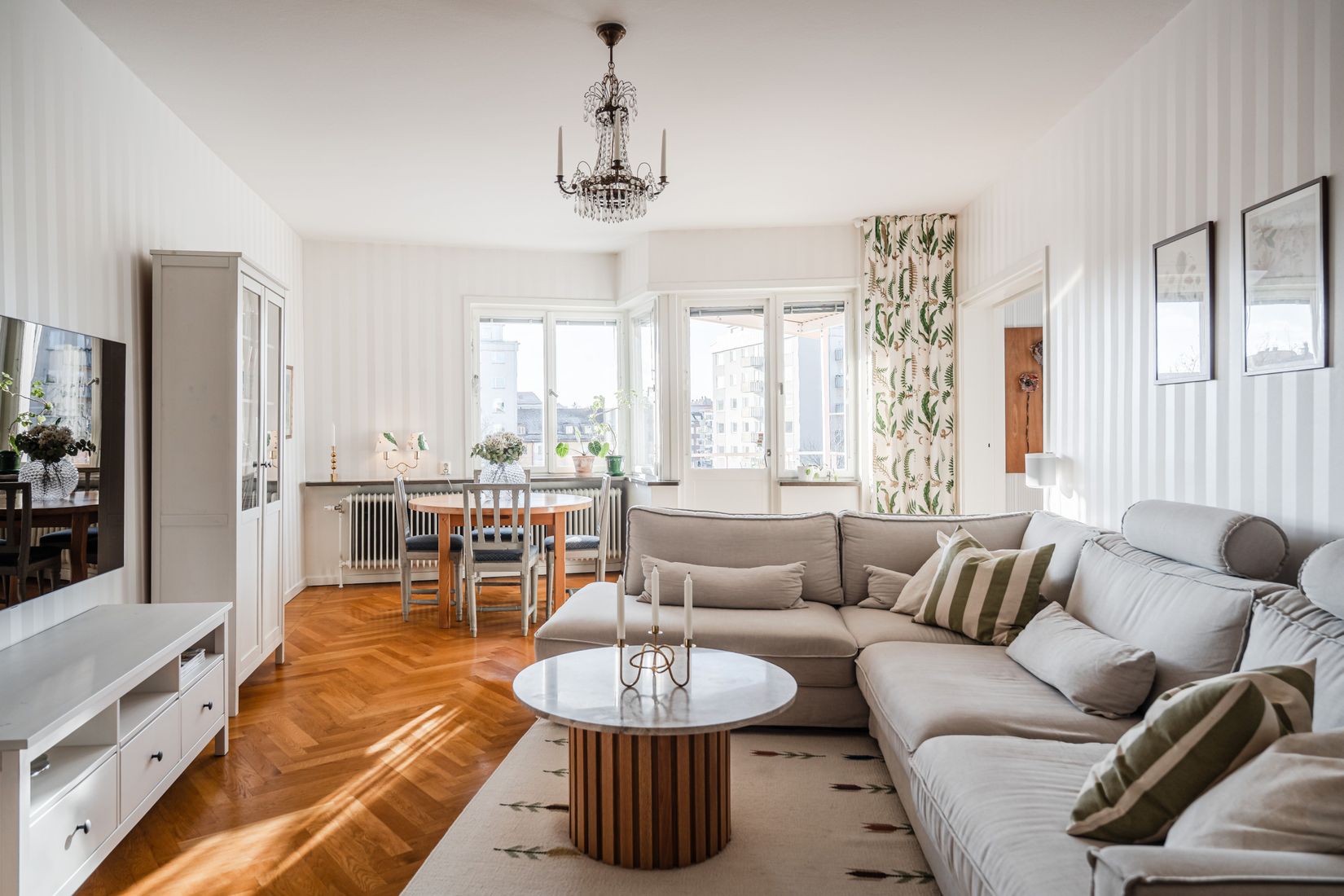 Bostaden omfattar 87,5 kvm fördelade på tre rum och kök med en planlösning som skapar generösa sällskapsytor och ett vackert ljusflöde genom hemmet. Vardagsrummet utgör hemmets naturliga samlingspunkt, där stora fönsterpartier tillsammans med den klassiska fiskbensparketten skapar en elegant och tidlös atmosfär. Den fungerande öppna spisen bidrar med både värme och karaktär, och härifrån nås balkongen som förlänger rummet under årets ljusare månader.