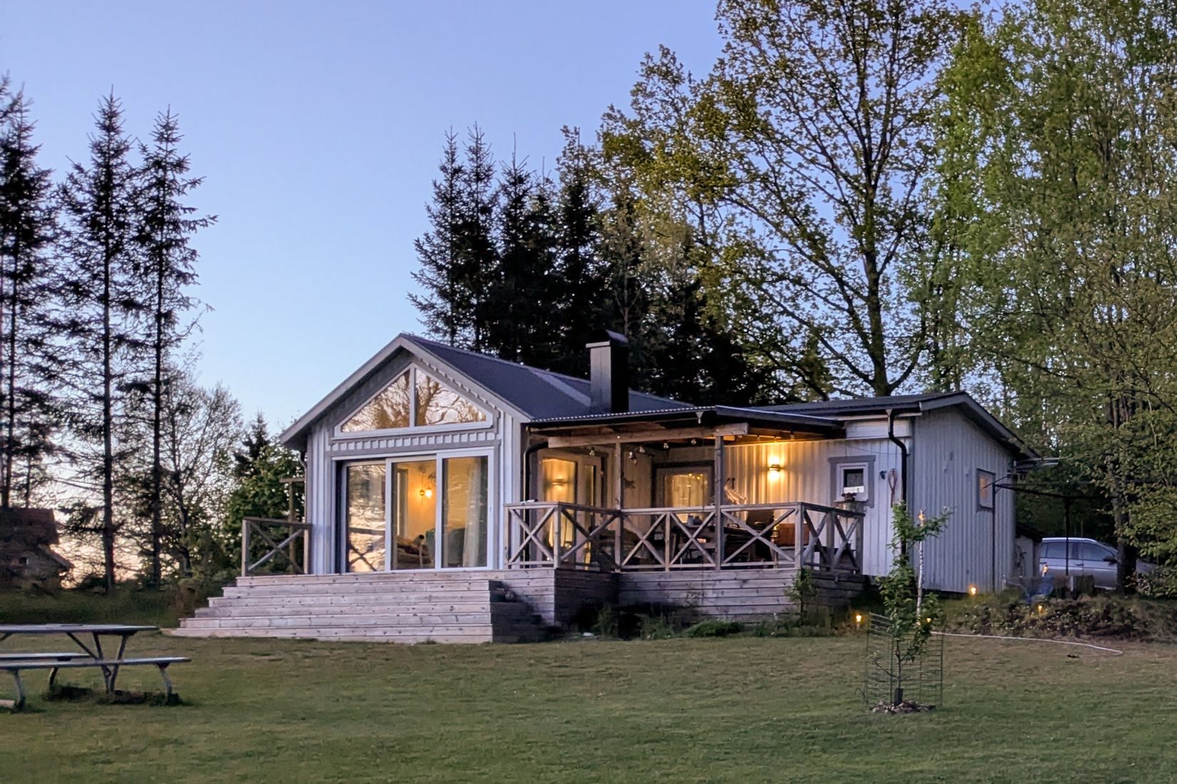 På tomten finns även en mysig gäststuga med plats för dubbelsäng och soffgrupp – perfekt för övernattande gäster eller som en avskild plats för lugn och ro.