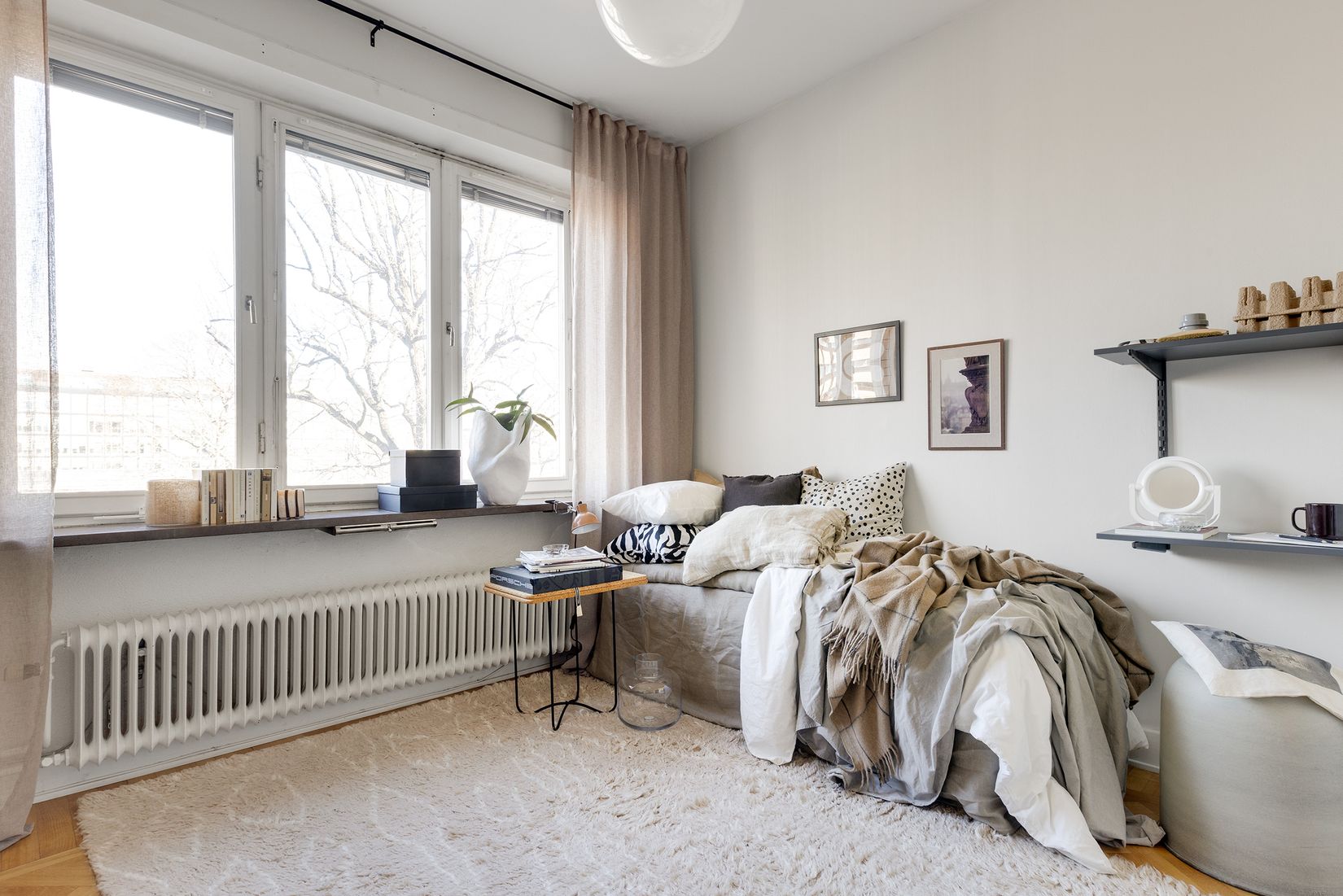 Planlösningen är genomtänkt och flexibel med plats för säng, matbord och skrivbord. Förvaringen är utmärkt med tre garderober samt två tillhörande förråd.