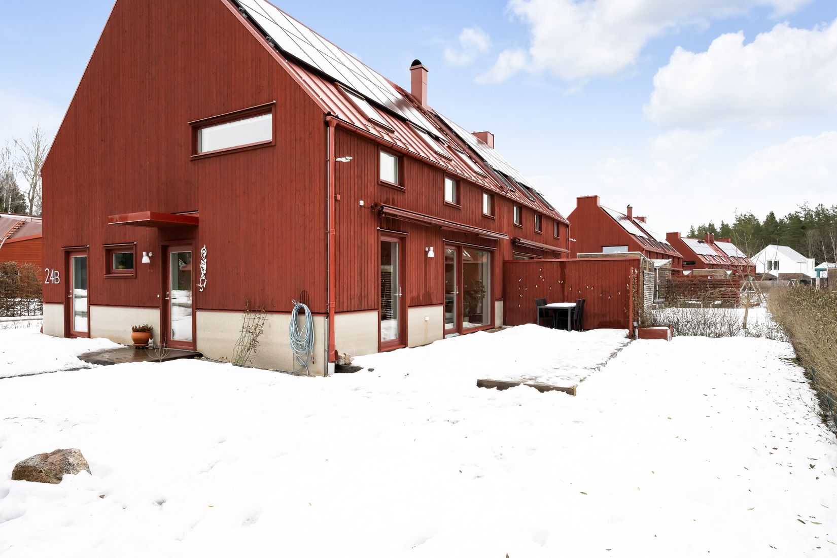 Trädgården är rymlig och erbjuder uteplatser på både fram- och baksida. På baksidan finns en generös trall i söderläge med plats för stor matgrupp, loungemöbler och grill. Här finns även gräsmatta med utrymme för lek och odling. På framsidan väntar bostadens andra terrass - en perfekt plats att njuta av kvällssolen när den sakta går ner bakom trädtopparna. Bilen parkerar du smidigt i carport och på uppfarten ryms flera bilar. Här finns elbilsladdare installerat.