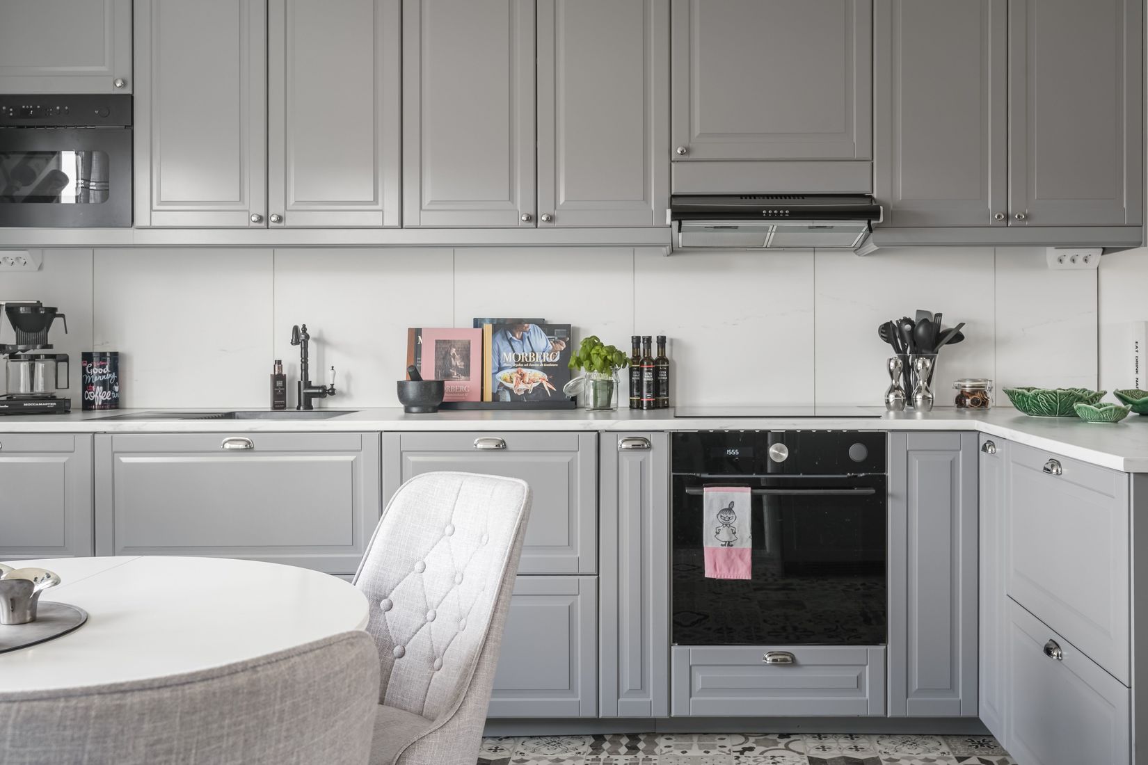 Bostaden har en social och öppen planlösning mellan kök och vardagsrum, vilket skapar en ljus och inbjudande atmosfär. Köket totalrenoverades 2024 i stilrena grå toner och erbjuder gott om arbetsyta och förvaring. Från vardagsrummet nås den soliga balkongen i söderläge, en underbar plats för morgonkaffet eller avkoppling i solen.