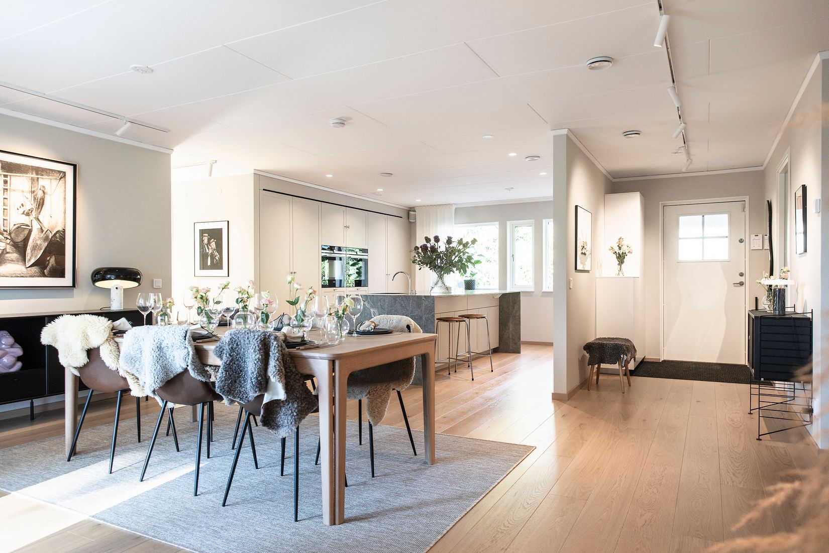 Planlösningen är generös och välbalanserad, med öppna sällskapsytor där kök och vardagsrum binds samman i ett naturligt flöde. Här utgör det påkostade köket hemmets självklara mittpunkt – ett genomtänkt och exklusivt kök från IKEA, förädlat med luckor från Urban Front i en harmonisk kulör från Jotun, Lady Kalk. De integrerade vitvarorna bidrar till ett stilrent uttryck, medan ugn och kombiugn från Siemens, utrustade med pyrolys och wifi-funktion, erbjuder modern funktionalitet i toppklass.