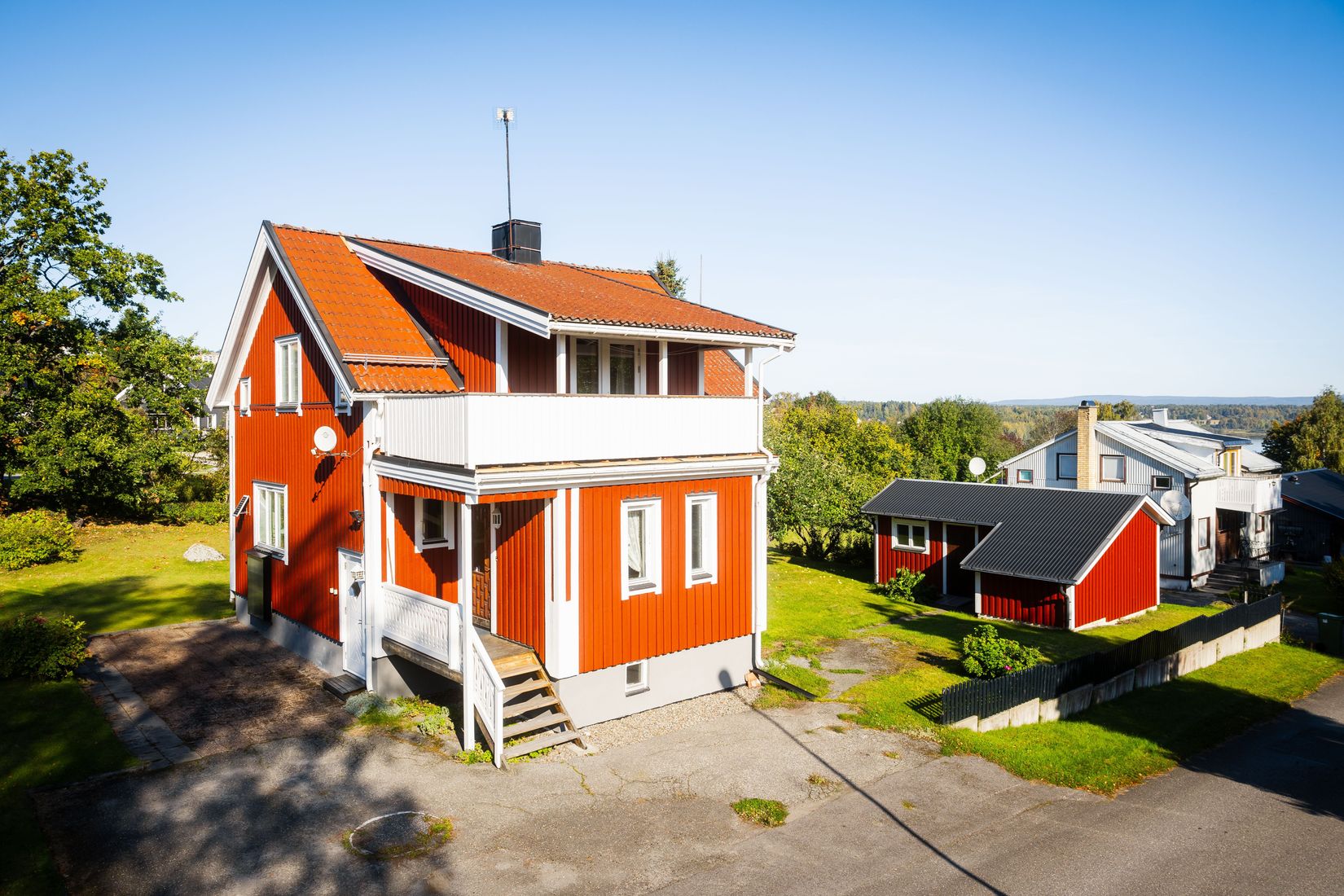 På övervåningen finns två sovrum med intilliggande alkover och en härlig balkong med utsikt mot Klingerfjärden.