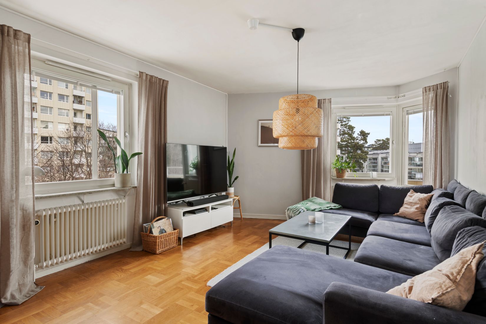Köket har gedigna arbetsytor, matplats för 2-4 personer samt laminat på golv. Vardagsrum med ett fint ljusinsläpp från fönster i 2 väderstreck gör att lägenheten blir mycket ljus! Här ligger även den vackra original-parketten. Från vardagsrummet når ni även den härliga balkongen med förmiddagssol och insynsskyddat läge. Delvis kaklat badrum med dusch samt egen tvättmaskin. Badrummet renoverades i samband med stambytet 2006.